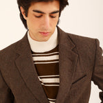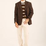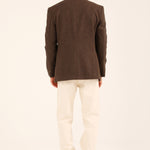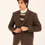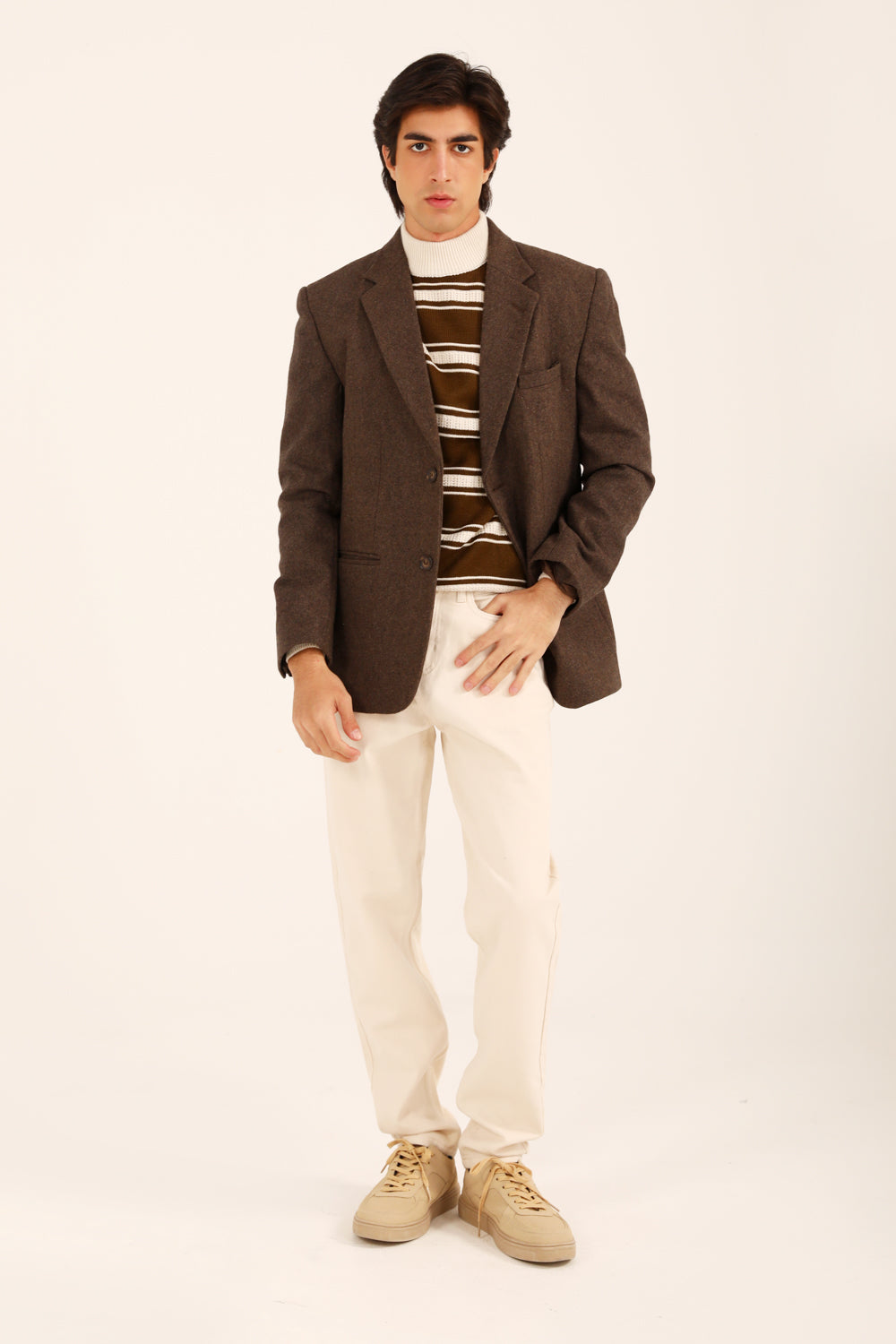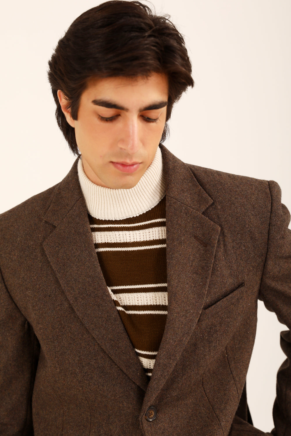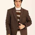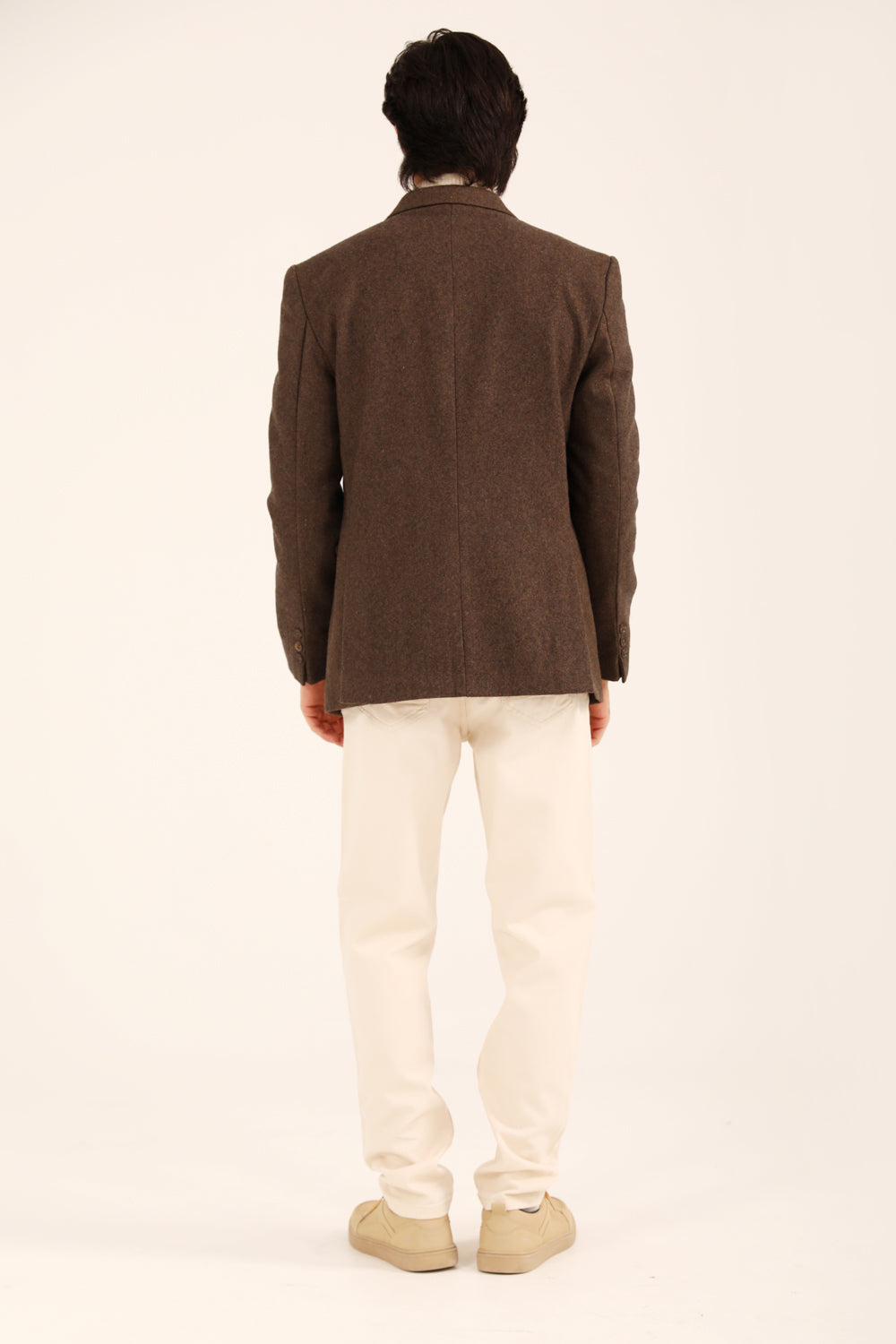 Brown textured wool blend coat with matching buttons and welt pockets.