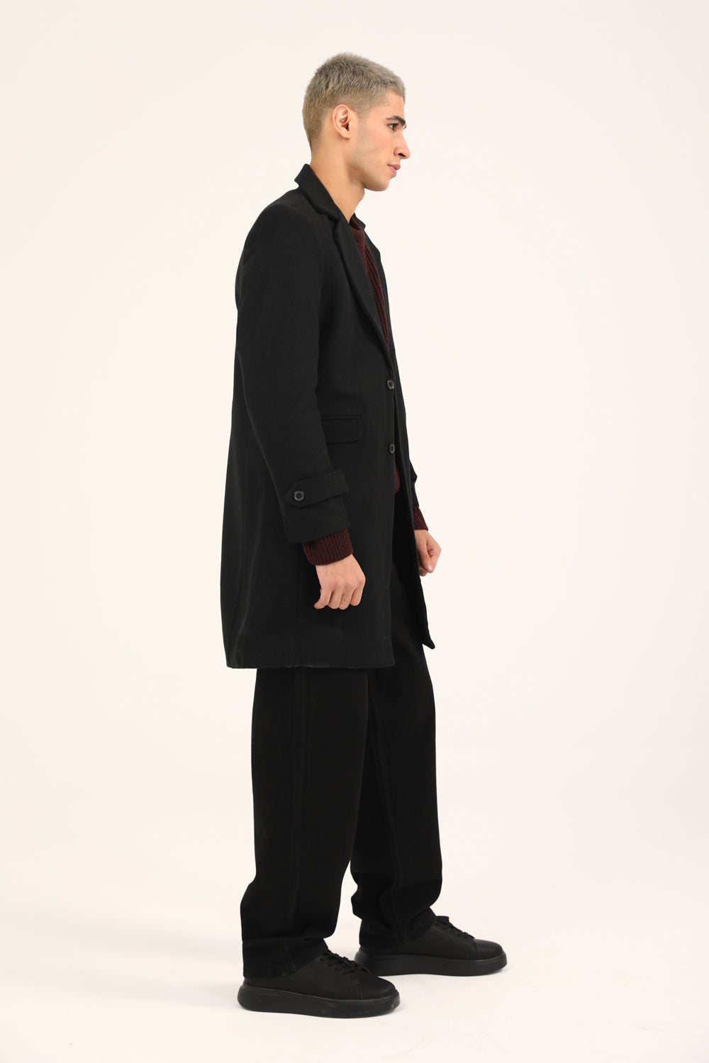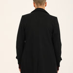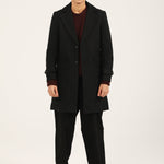 Black textured wool blend long coat with matching buttons and large lapels.