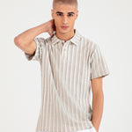 A grey and ecru polo woven in jacquard with vertical stripes and matching buttons.