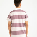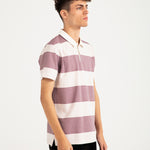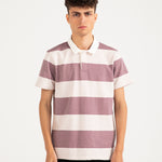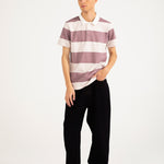 Dusty pink and off-white cotton polo with horizontal stripes.