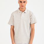 A grey and ecru polo woven in jacquard with vertical stripes and matching buttons.