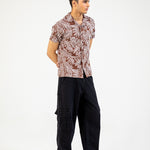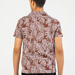A brown jacquard polo in a cotton blend with matching buttons and a relaxed resort collar.