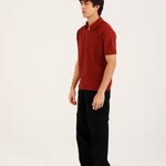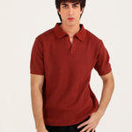 A knitted polo in a rich brick shade with a johnny collar and subtle texture that gives it a refined look.