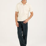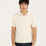 A knitted polo in a creamy off-white shade with a johnny collar and subtle texture that gives it a refined look.