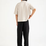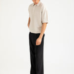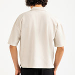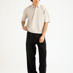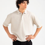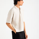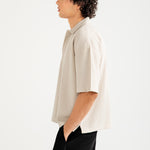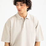 Stone colored polo in a soft cotton synthetic blend with a boxy fit, featuring a hidden placket and a plain finish.