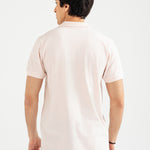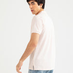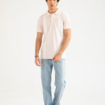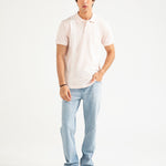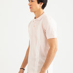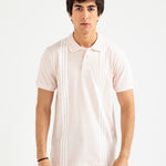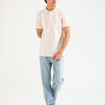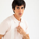 Light pink cotton polo with white vertical stripes, finished with matching buttons.