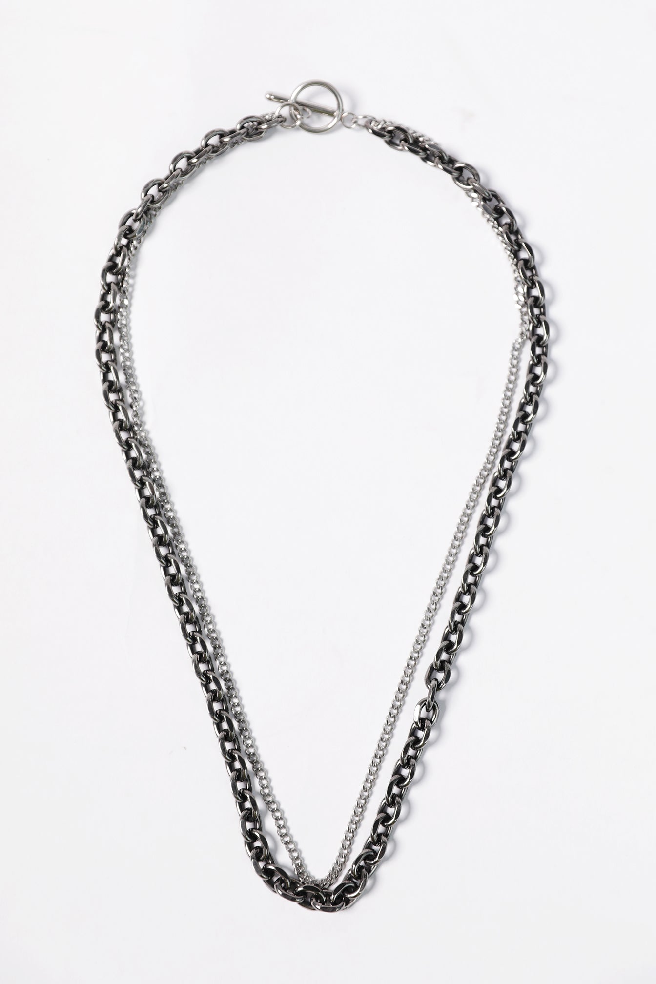 A layered necklace featuring a bold cable chain paired with a delicate curb chain for a striking contrast.