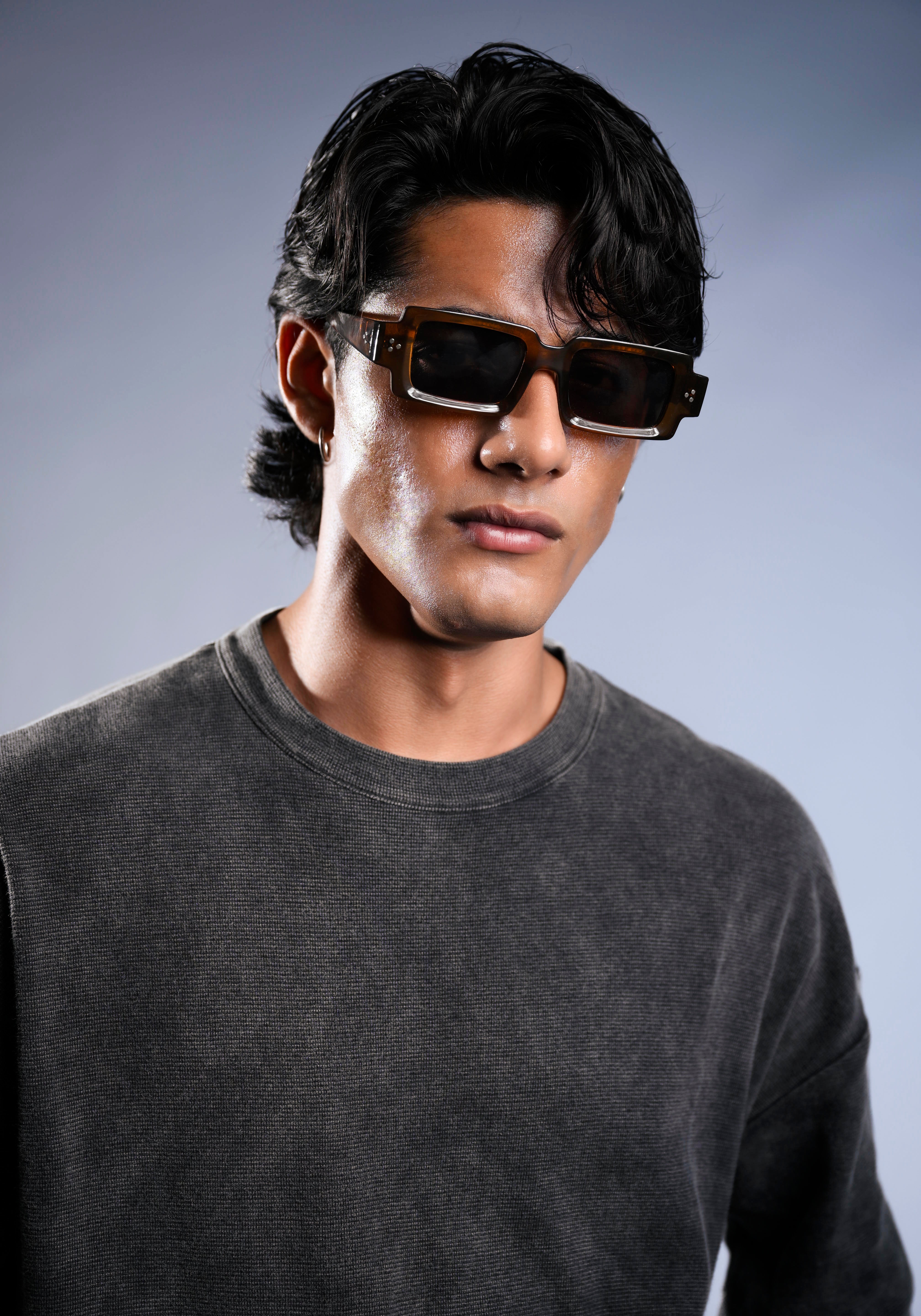 Brown low square sunglasses with a sleek, modern design for a stylish look.
