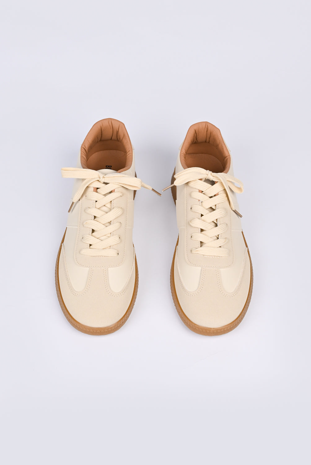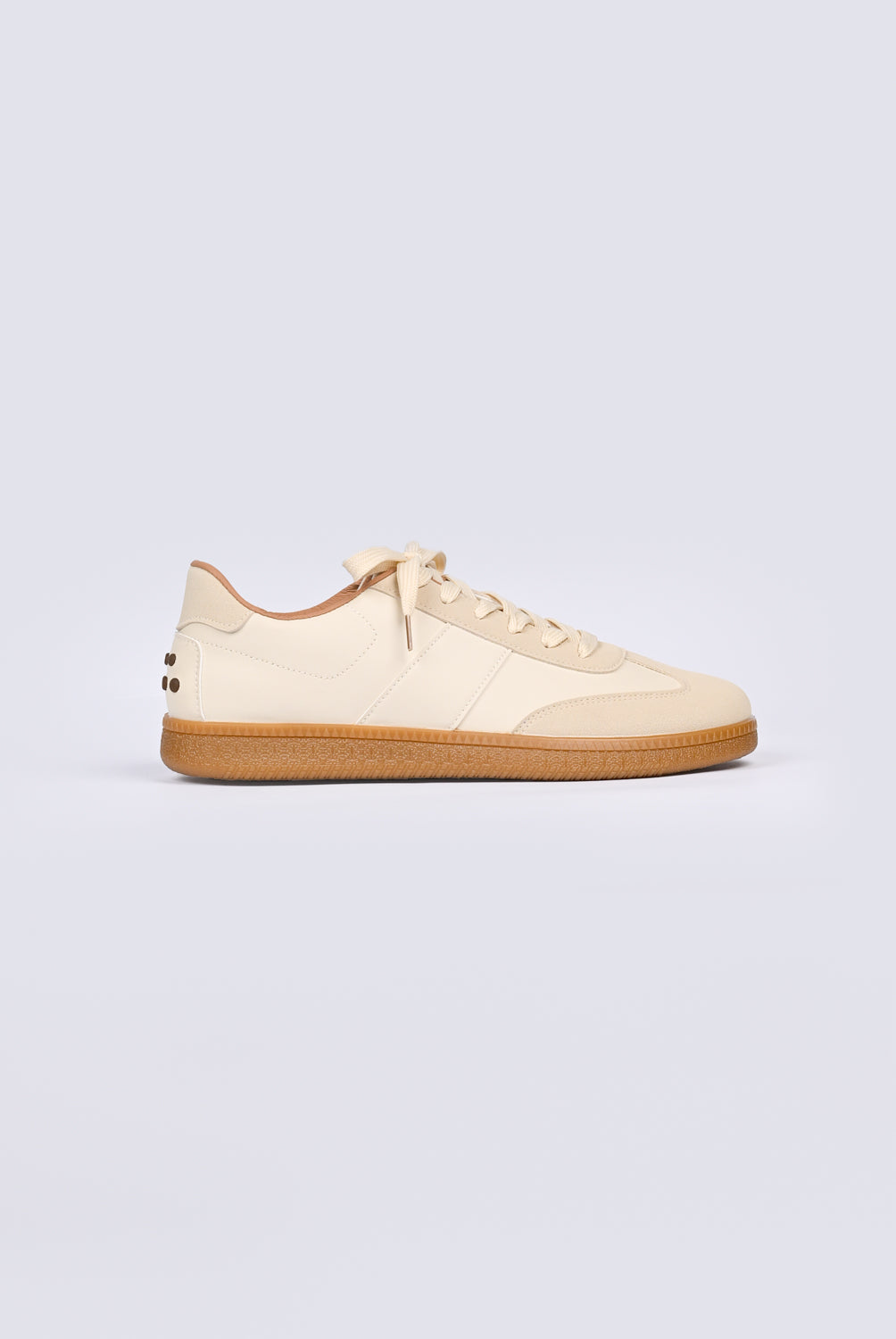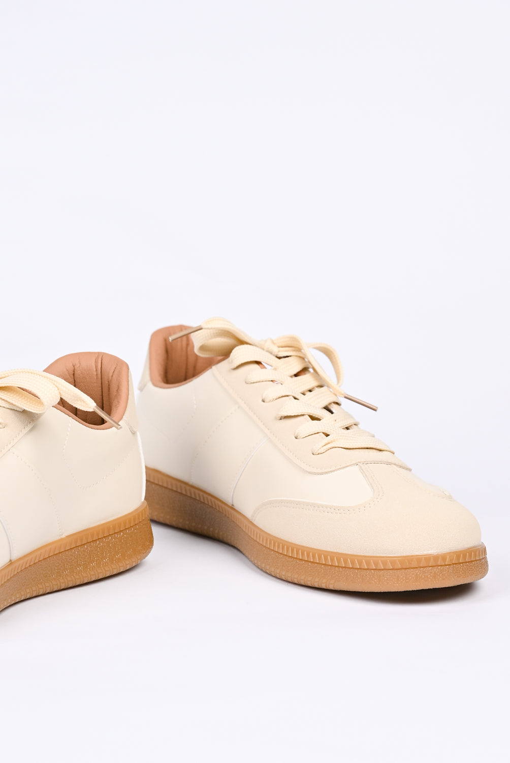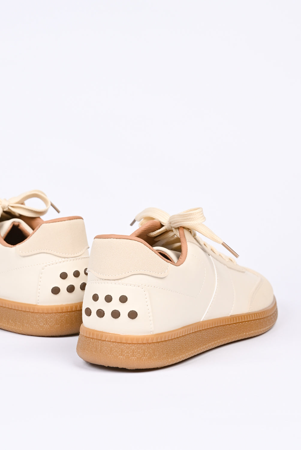 Minimal sneakers in light beige with tonal laces, a warm brown sole, and textured pebble detail on the heel for contrast.