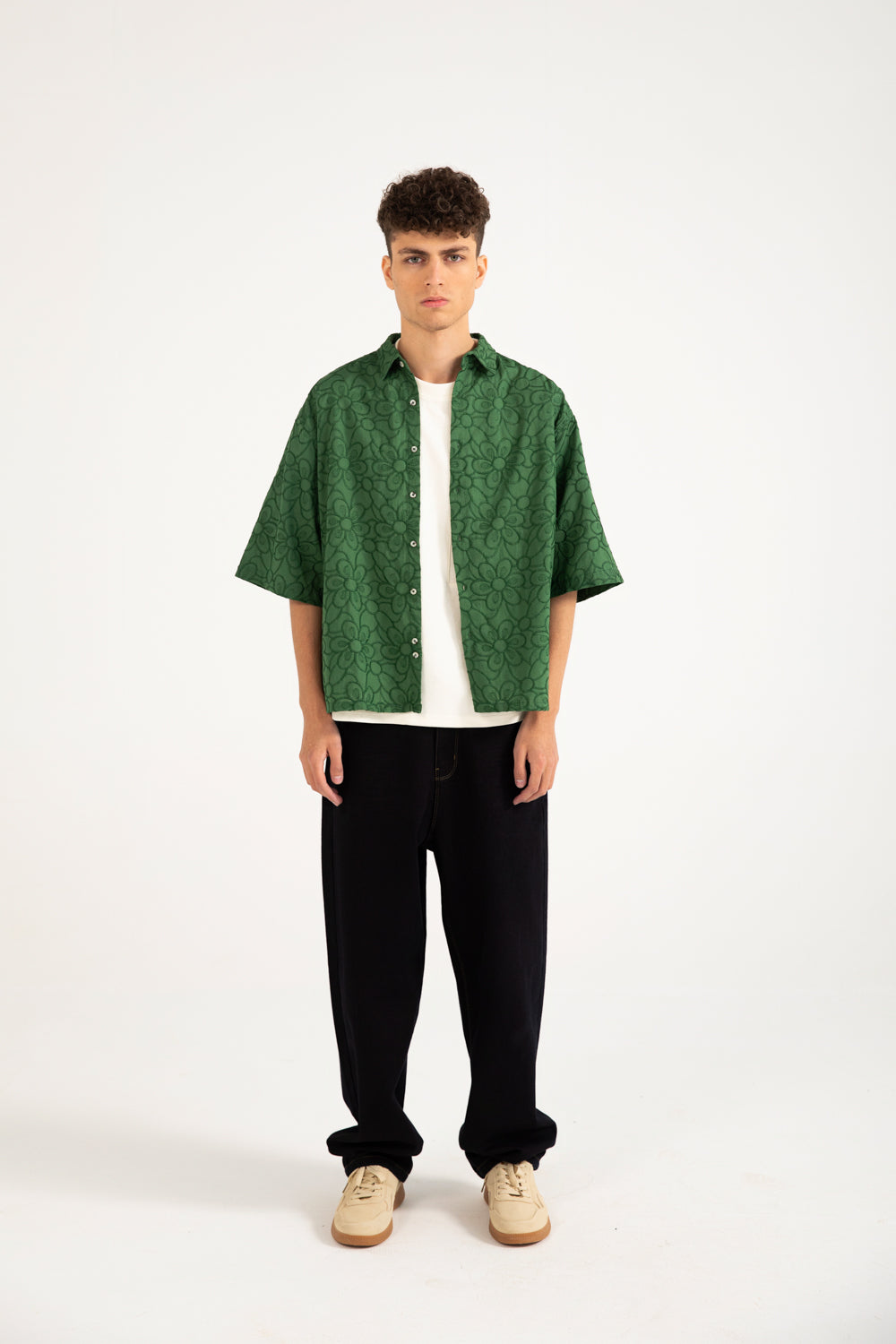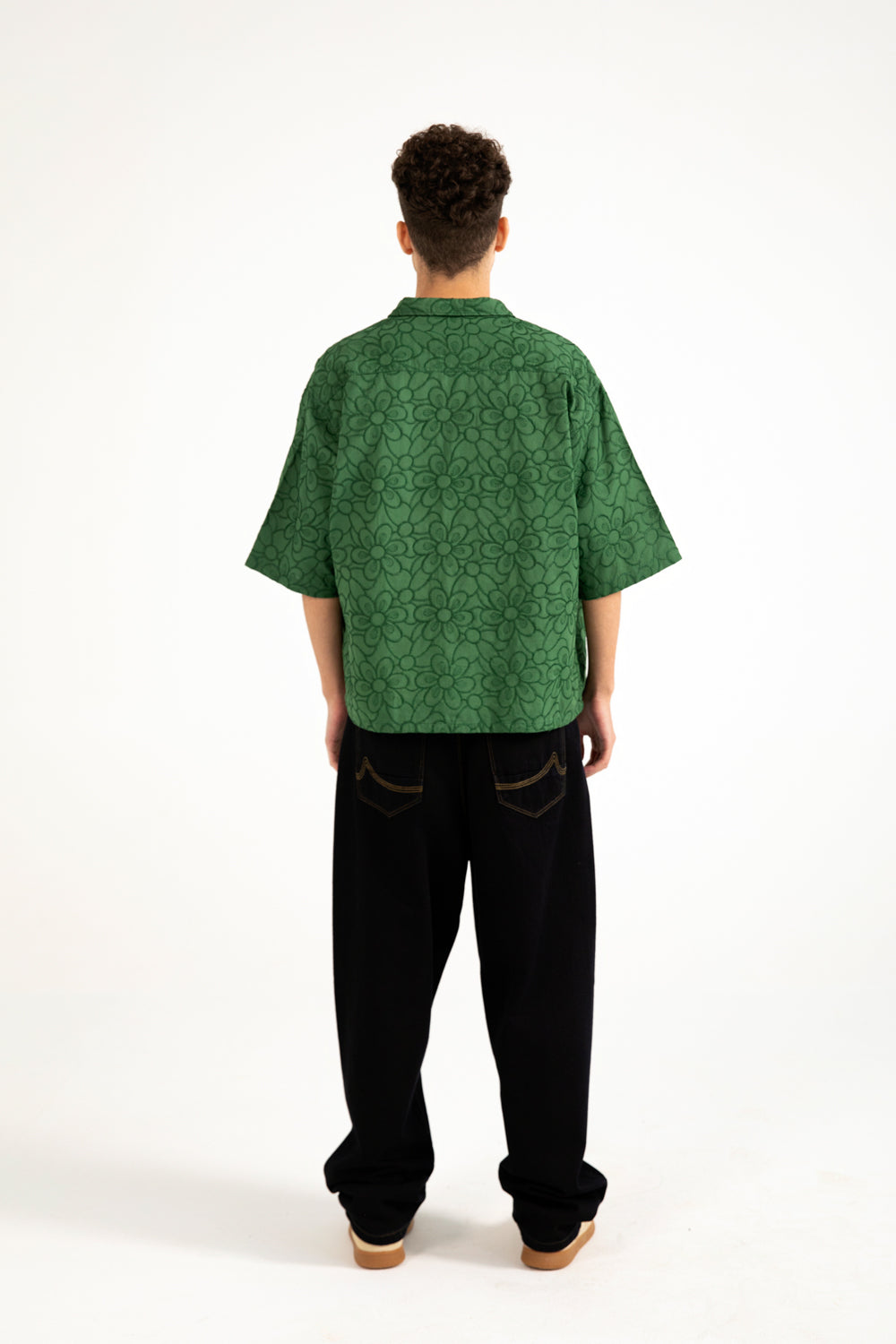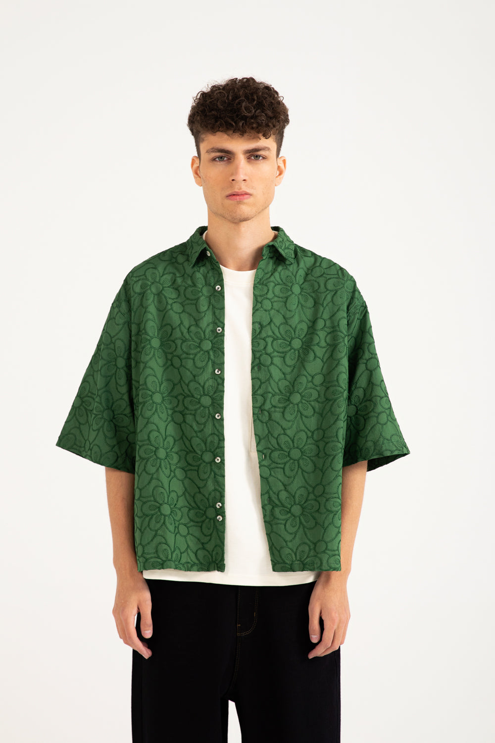 Green cotton shirt with a boxy fit, resort collar, and contrasting buttons.