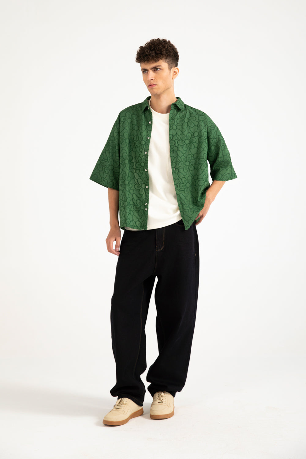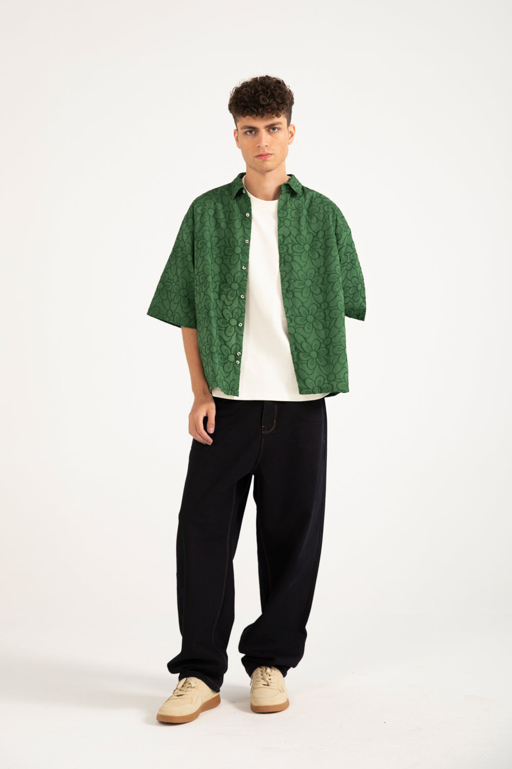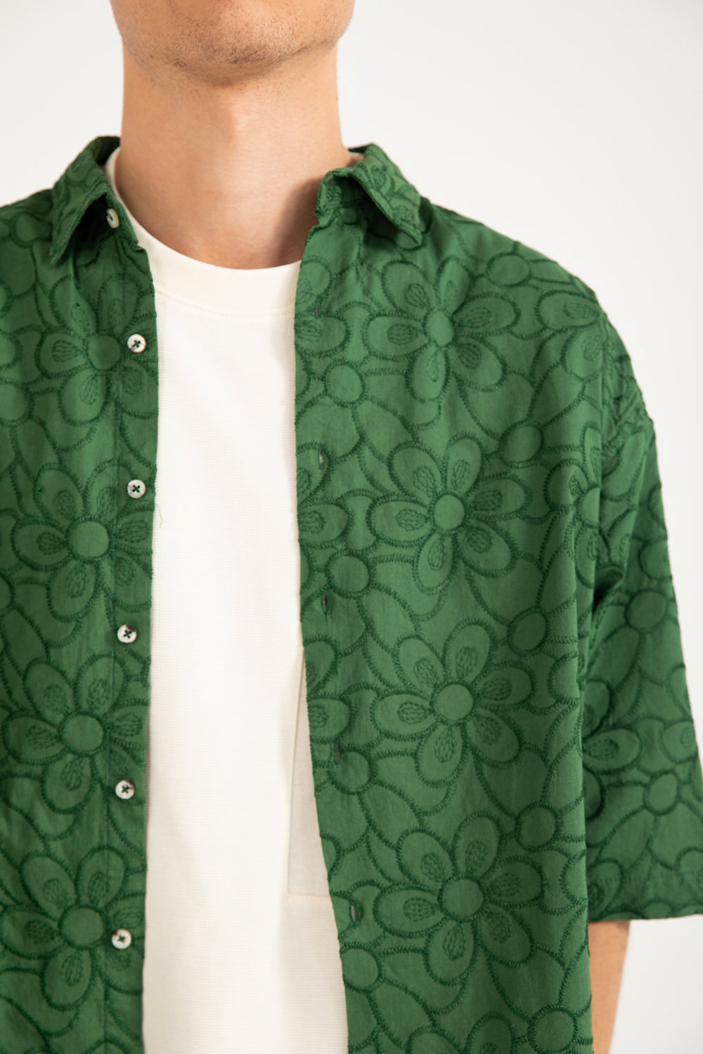 Green cotton shirt with a boxy fit, resort collar, and contrasting buttons.