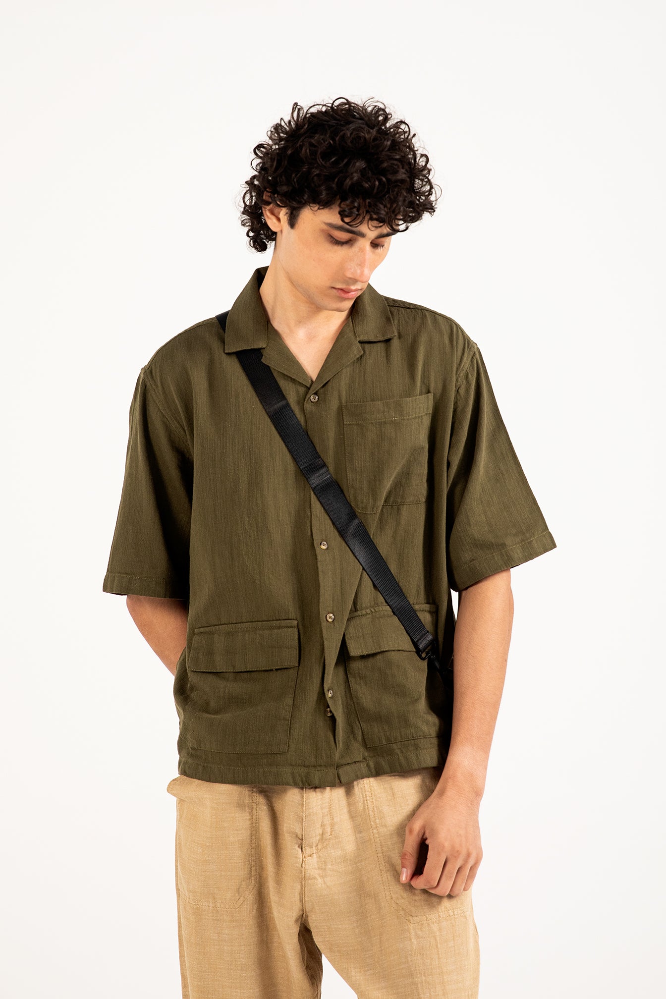 Cotton shirt with a textured finish, designed in a baggy fit featuring a resort collar, tonal buttons, a chest pocket, and two spacious lower-front pockets.
