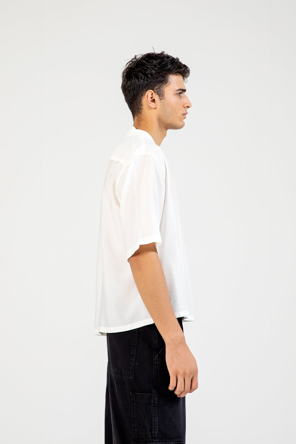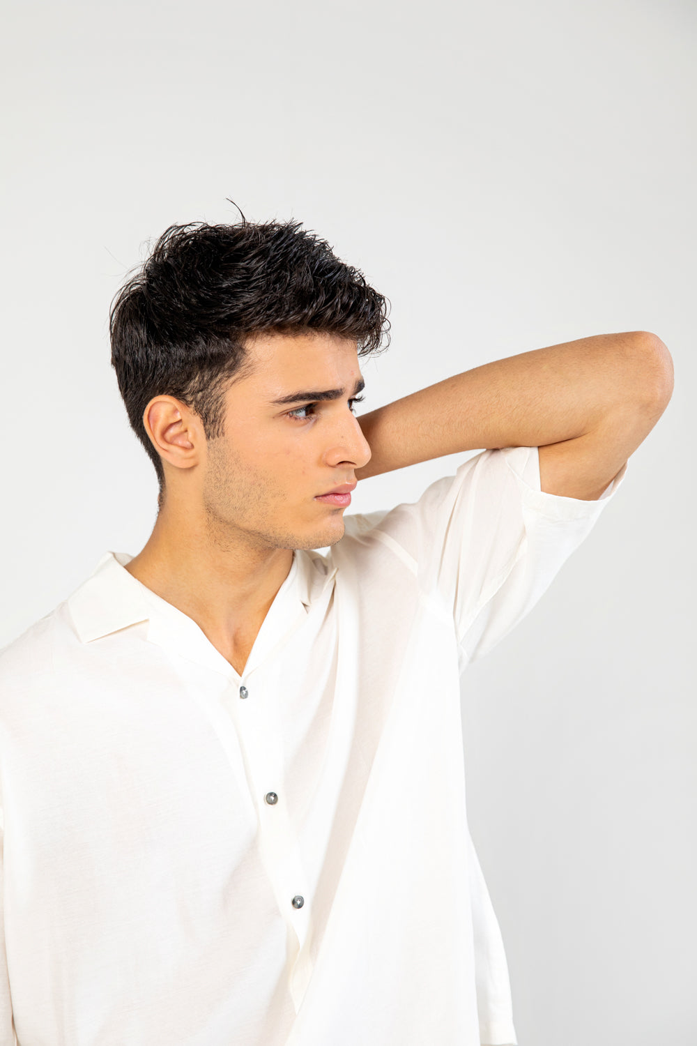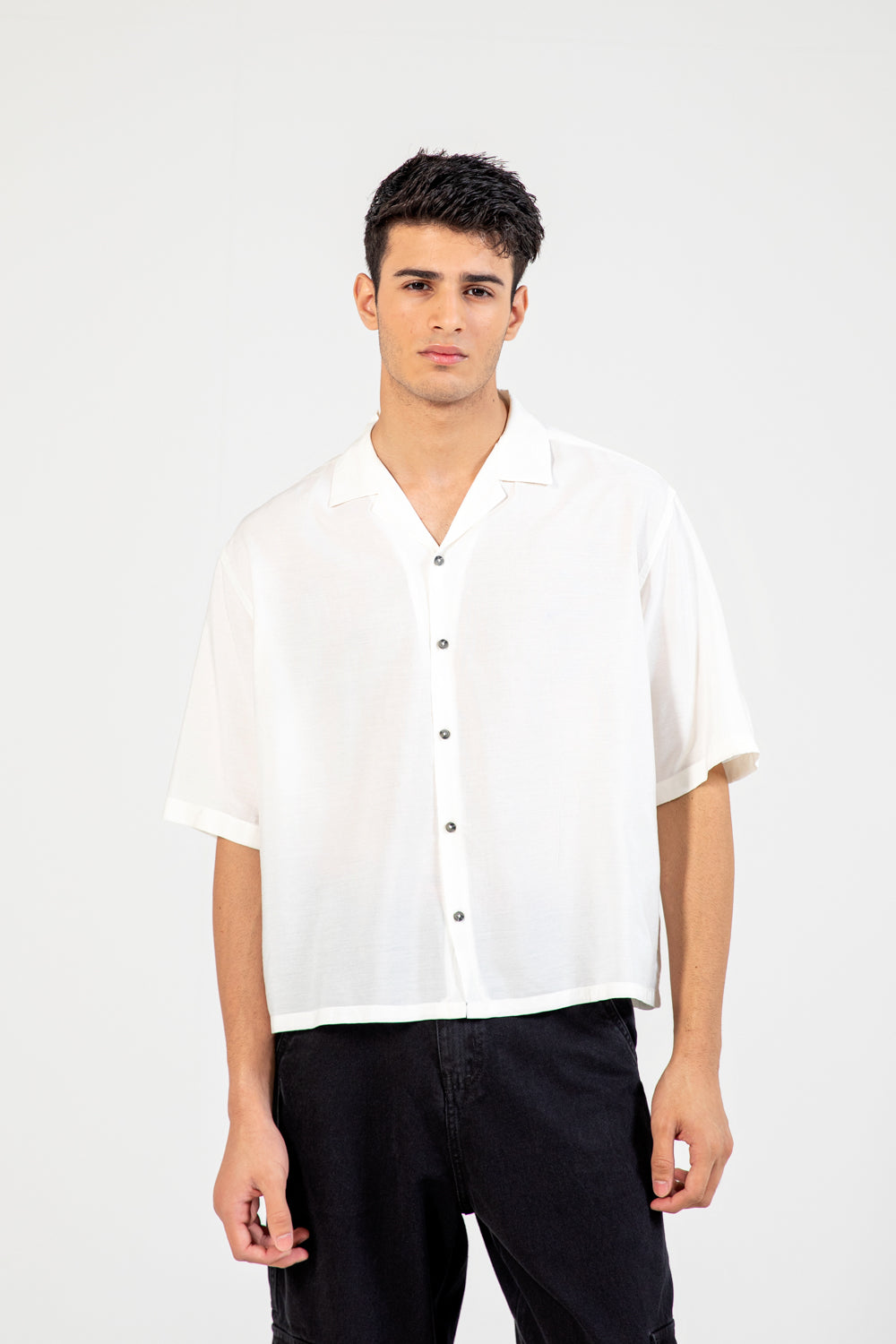 A white resort collar shirt in a cotton blend with a boxy fit and contrast buttons that add a subtle accent.