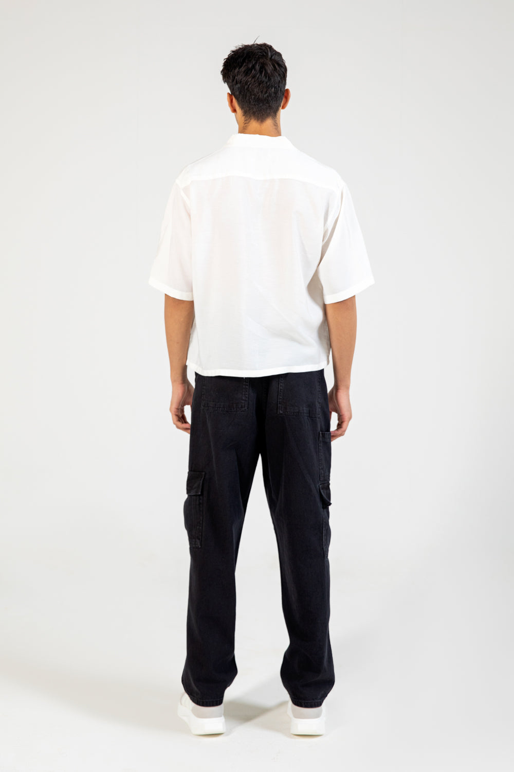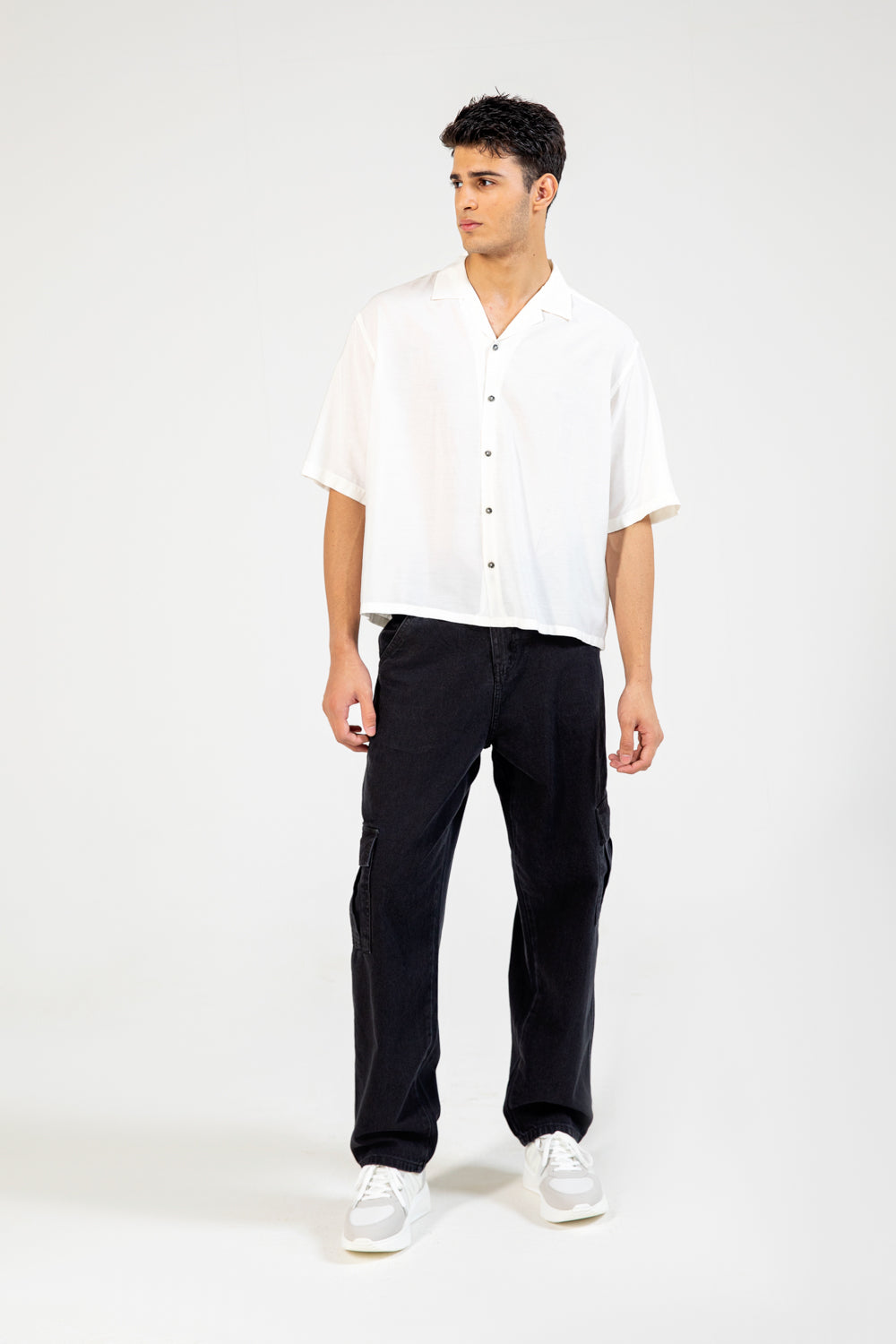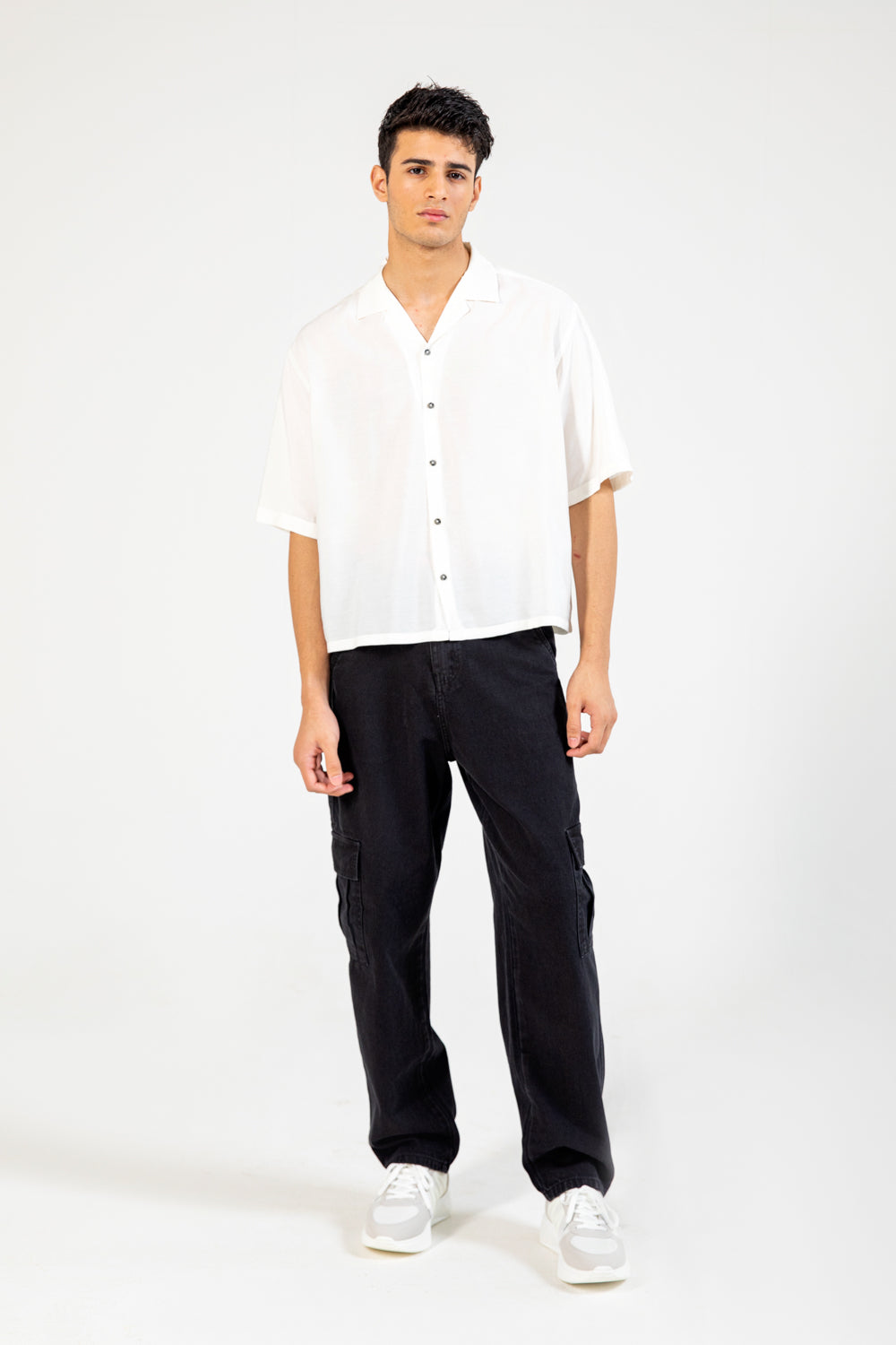 A white resort collar shirt in a cotton blend with a boxy fit and contrast buttons that add a subtle accent.