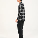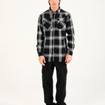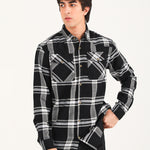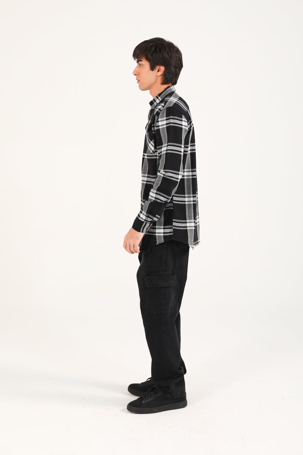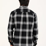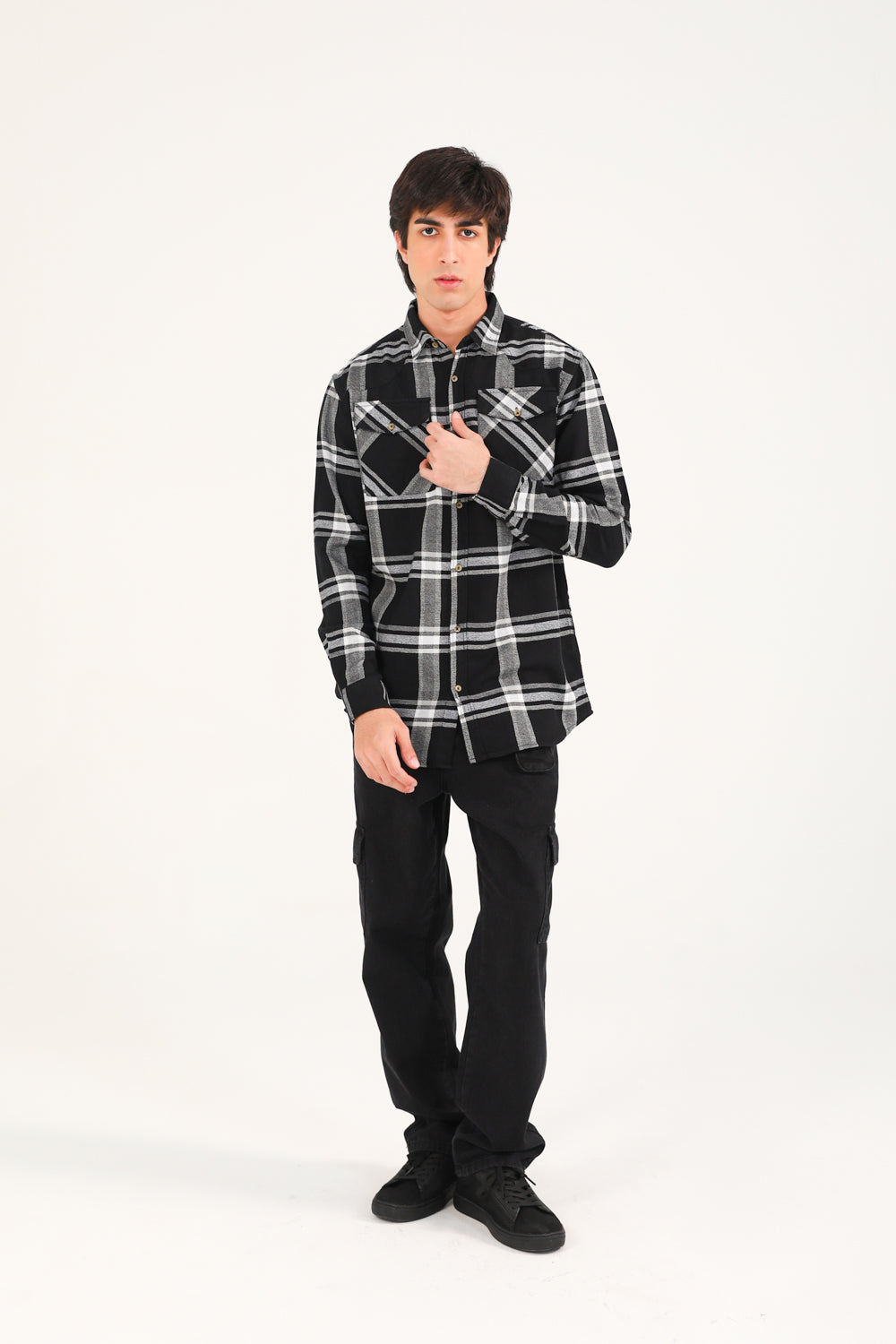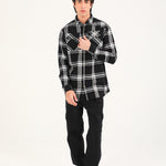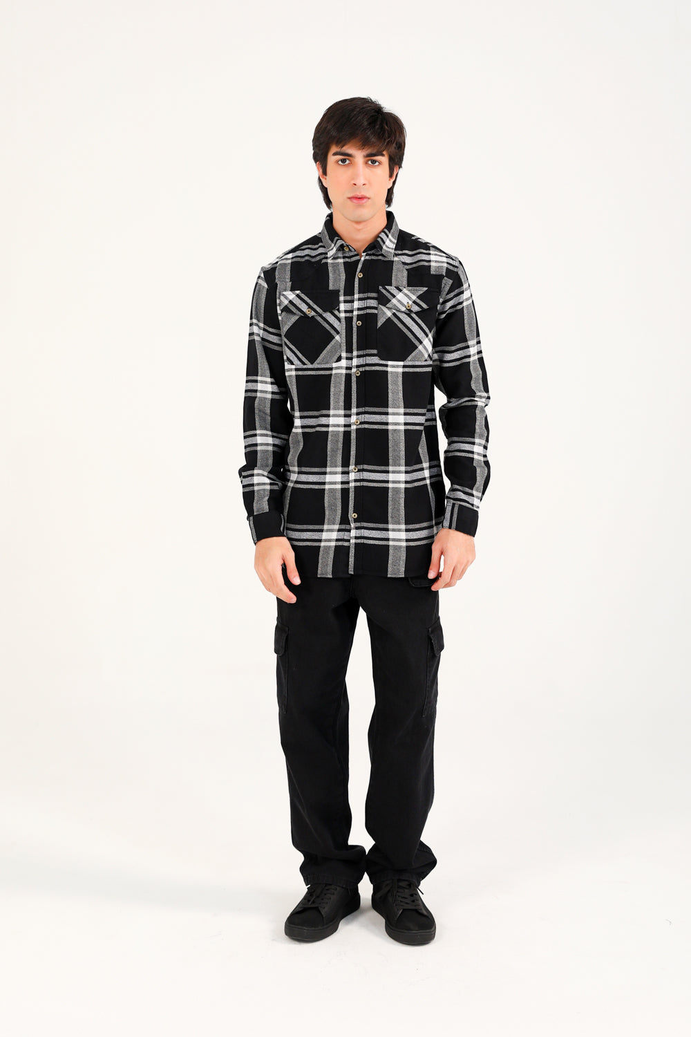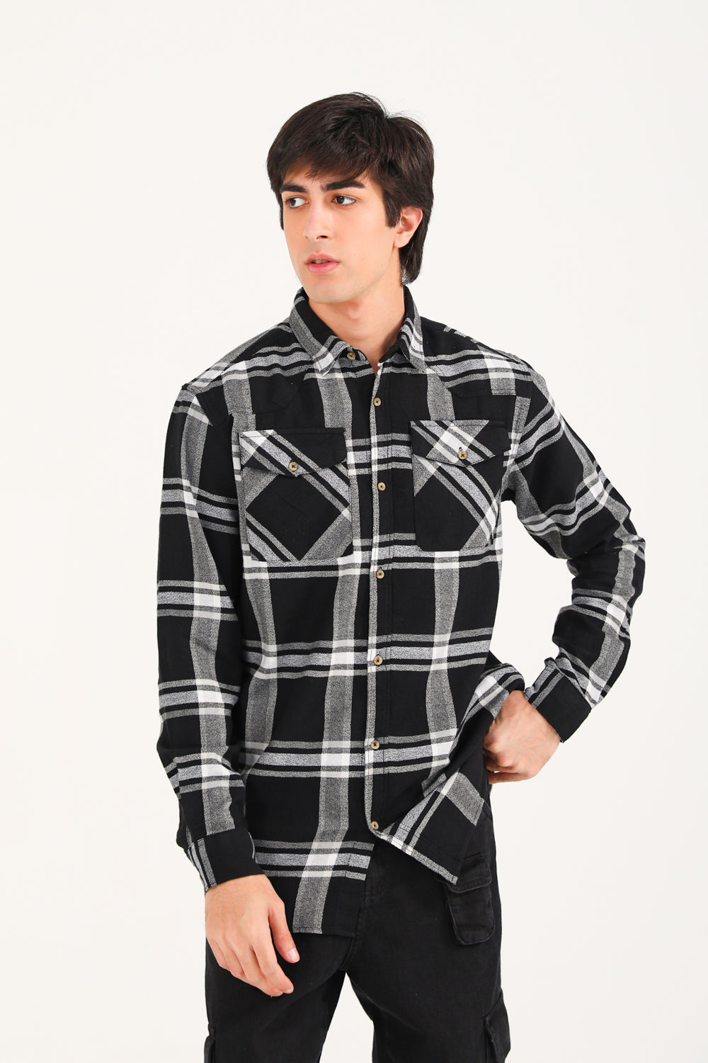 A black textured check button down shirt in cotton with chest pockets on each side for a balanced look.