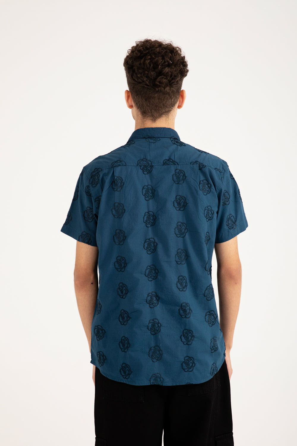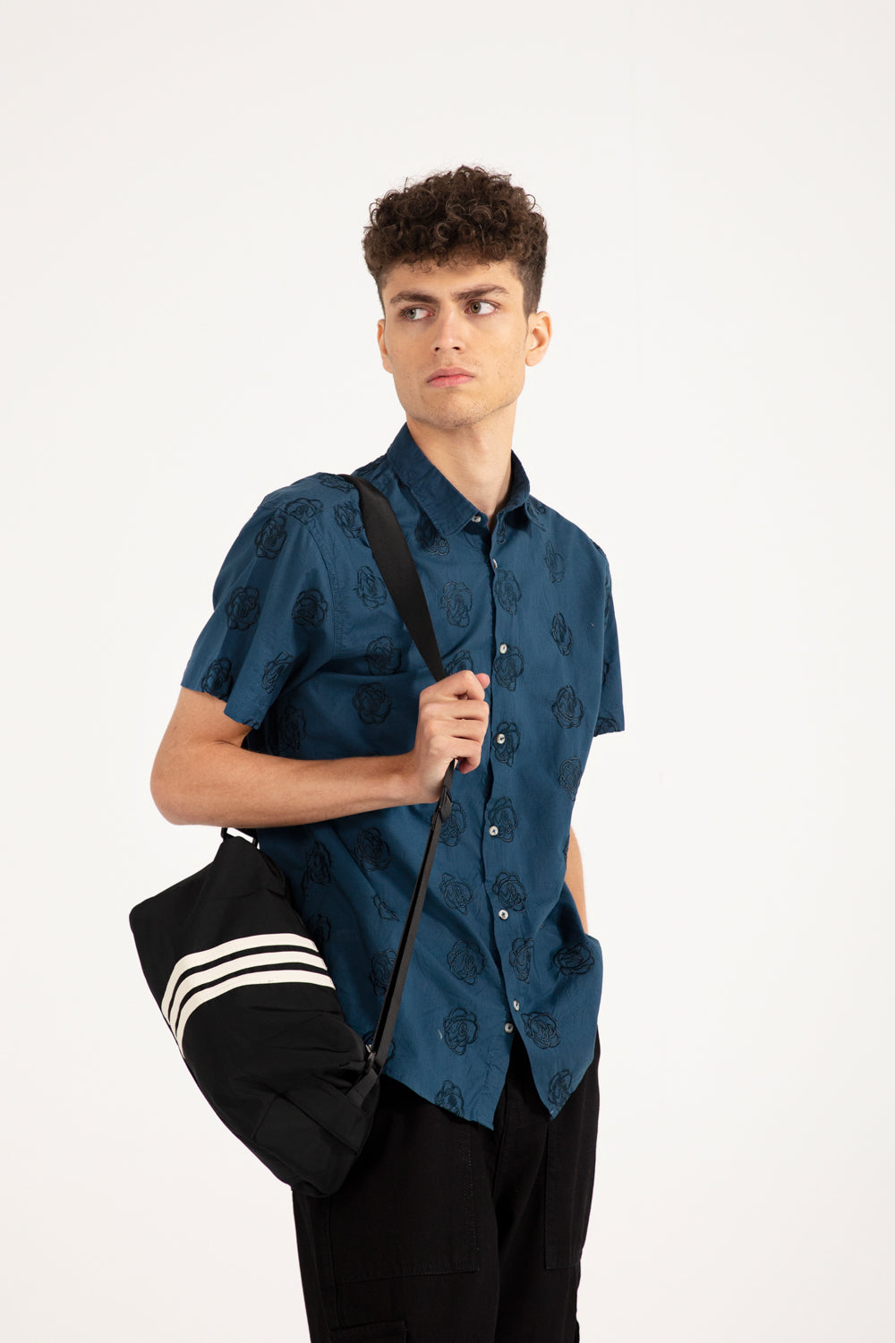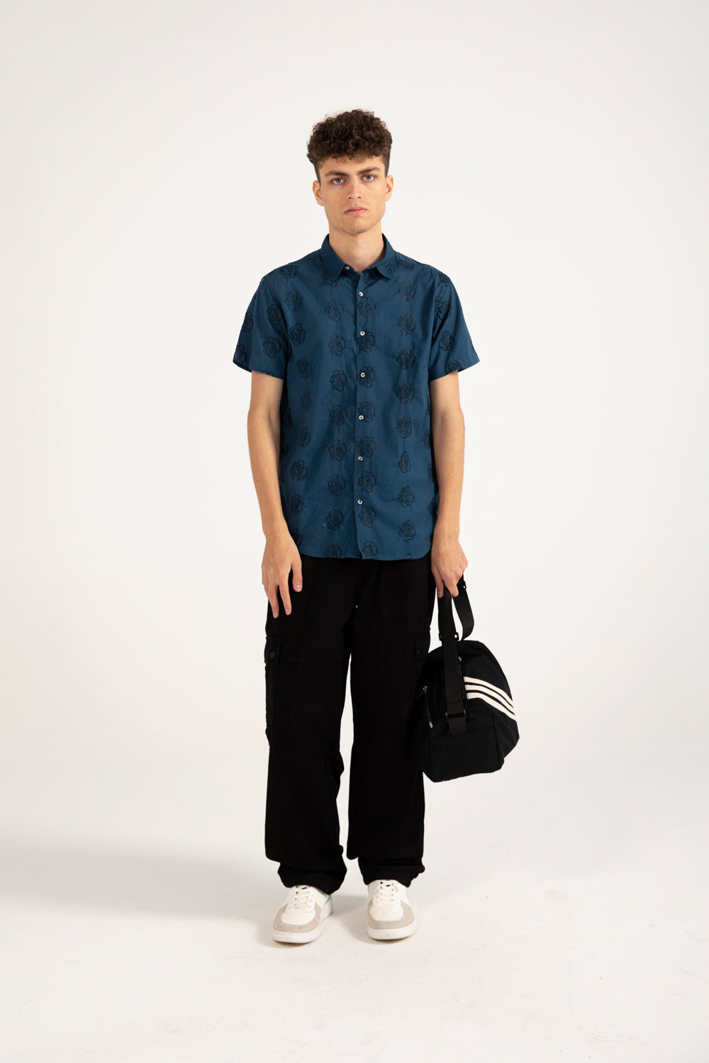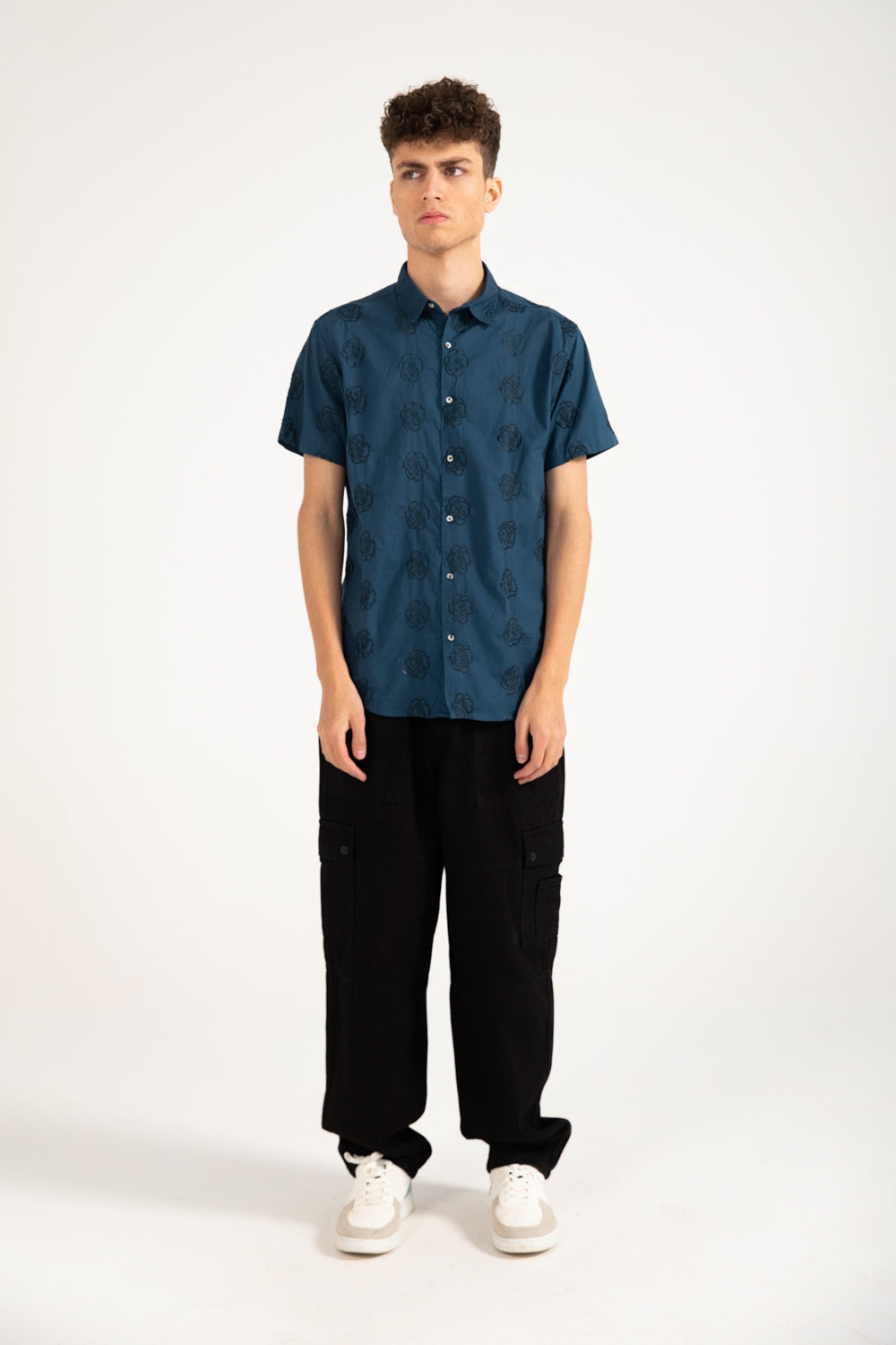 Blue cotton shirt with chikankari detailing, half sleeves, and contrasting buttons.