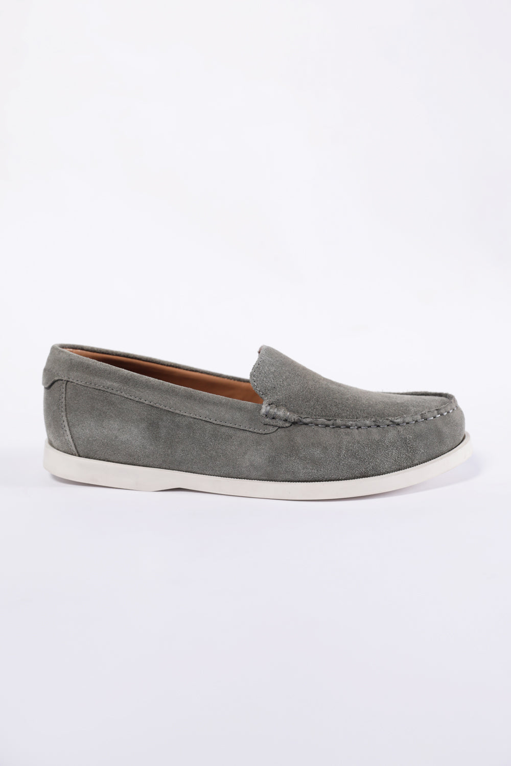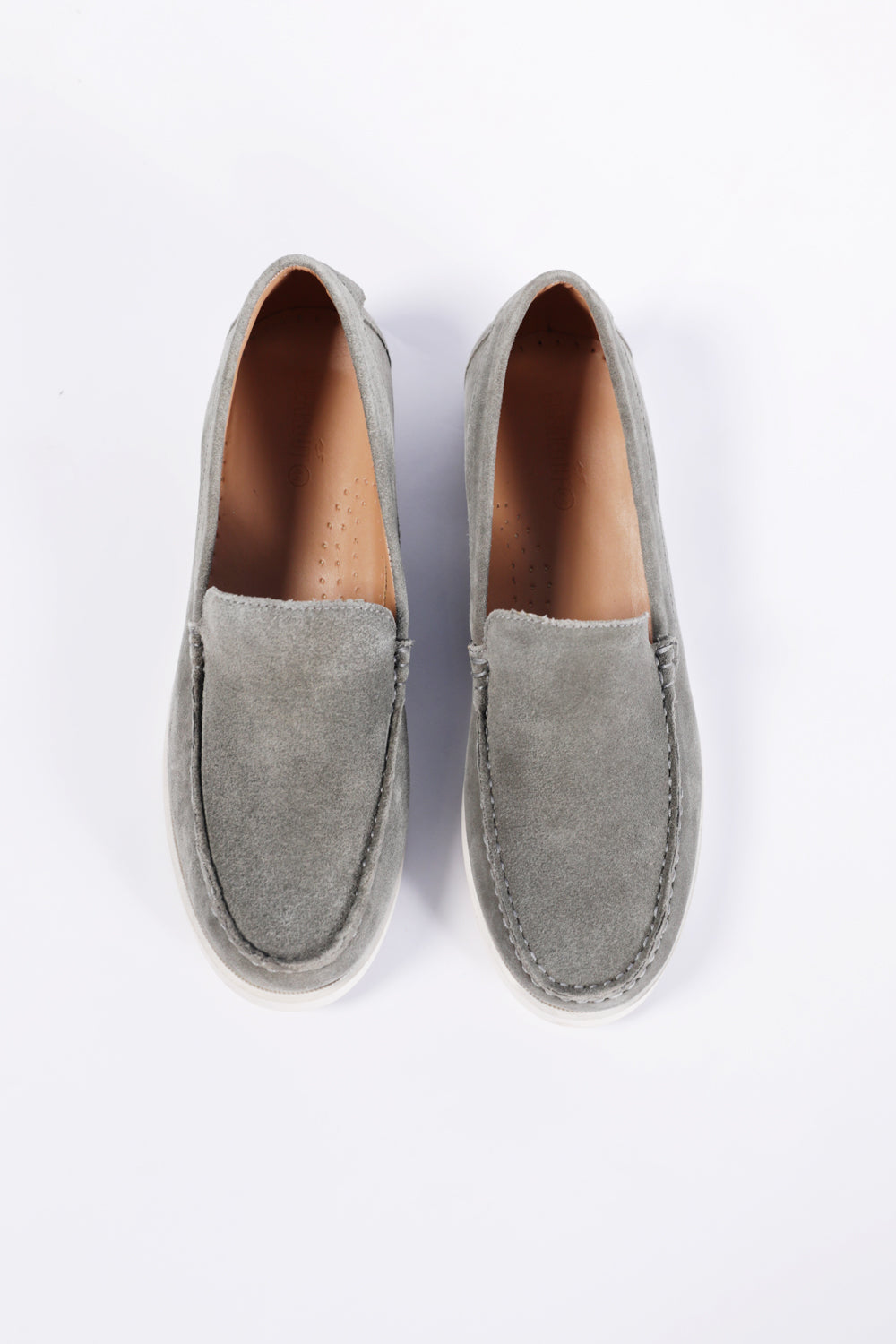 These grey suede loafers blend effortless style with everyday comfort. Set on a crisp white sole, they offer a refined yet contemporary look, perfect for any occasion.