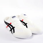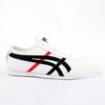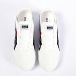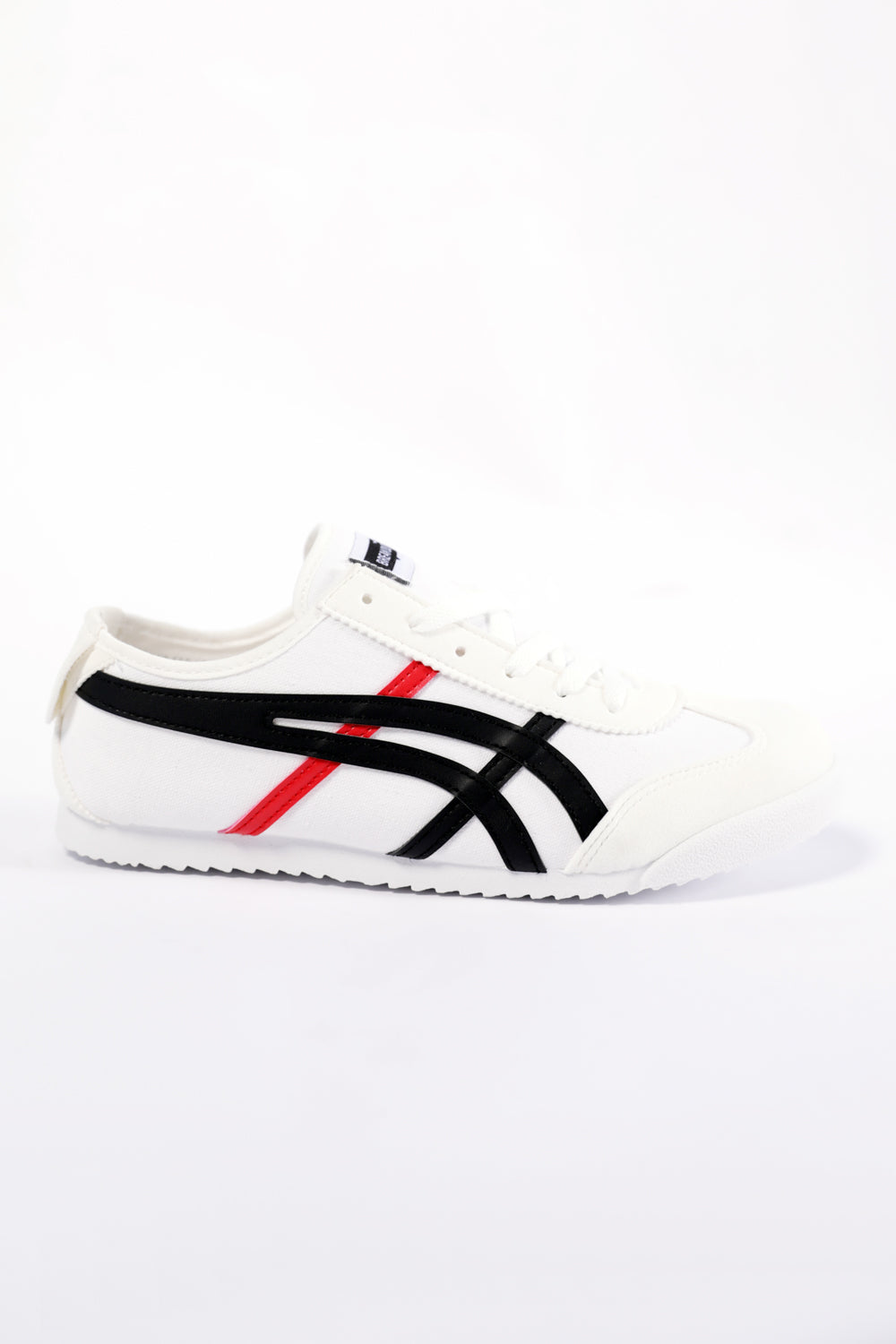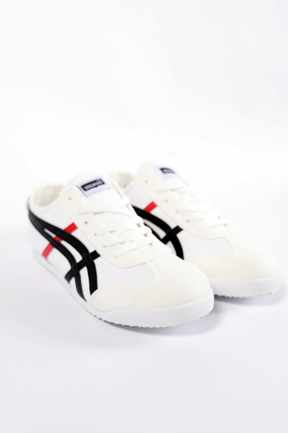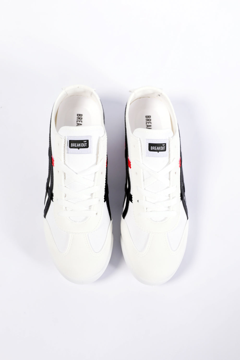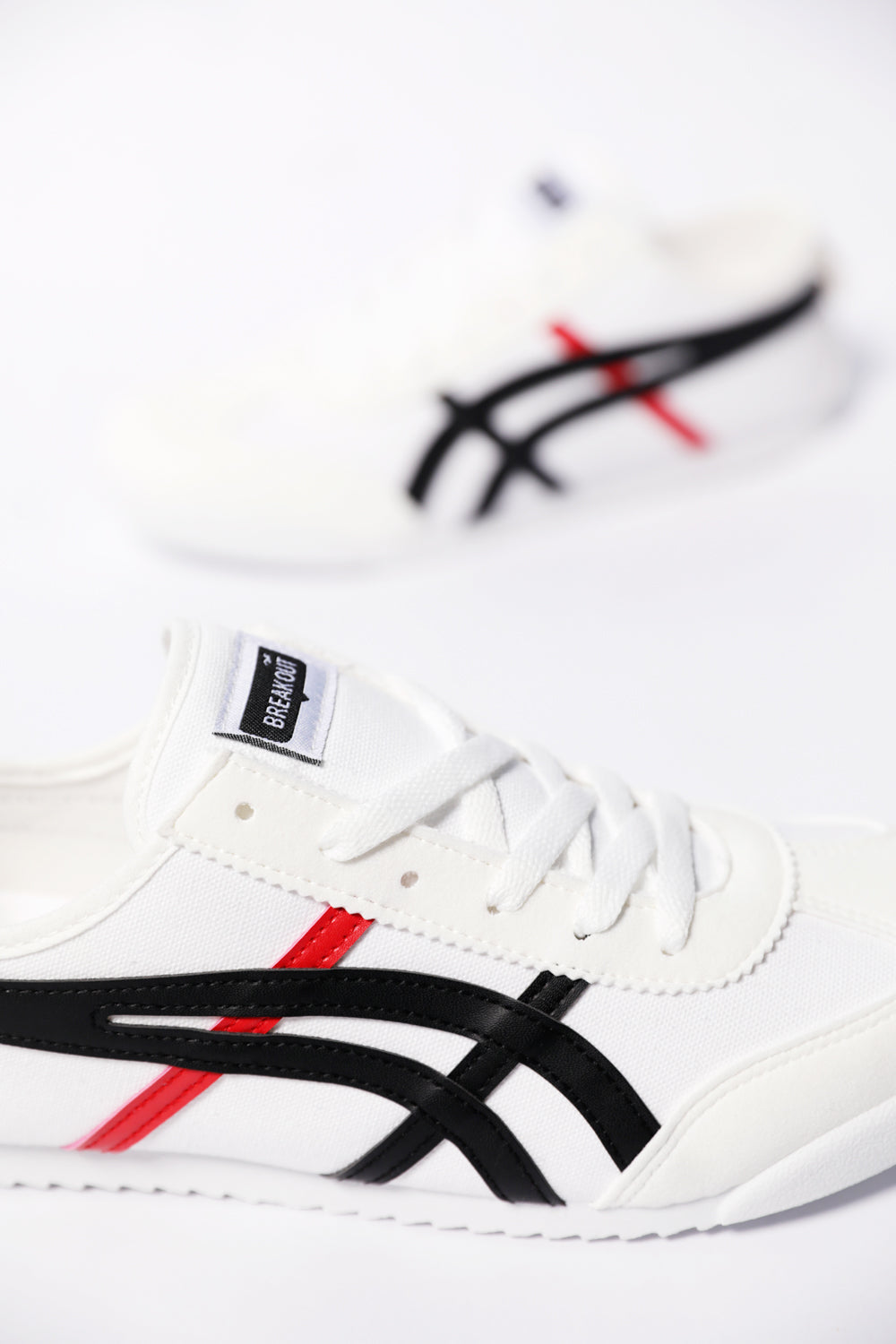 White trainers with bold black and red side stripes, finished with matching white laces for a sleek look.