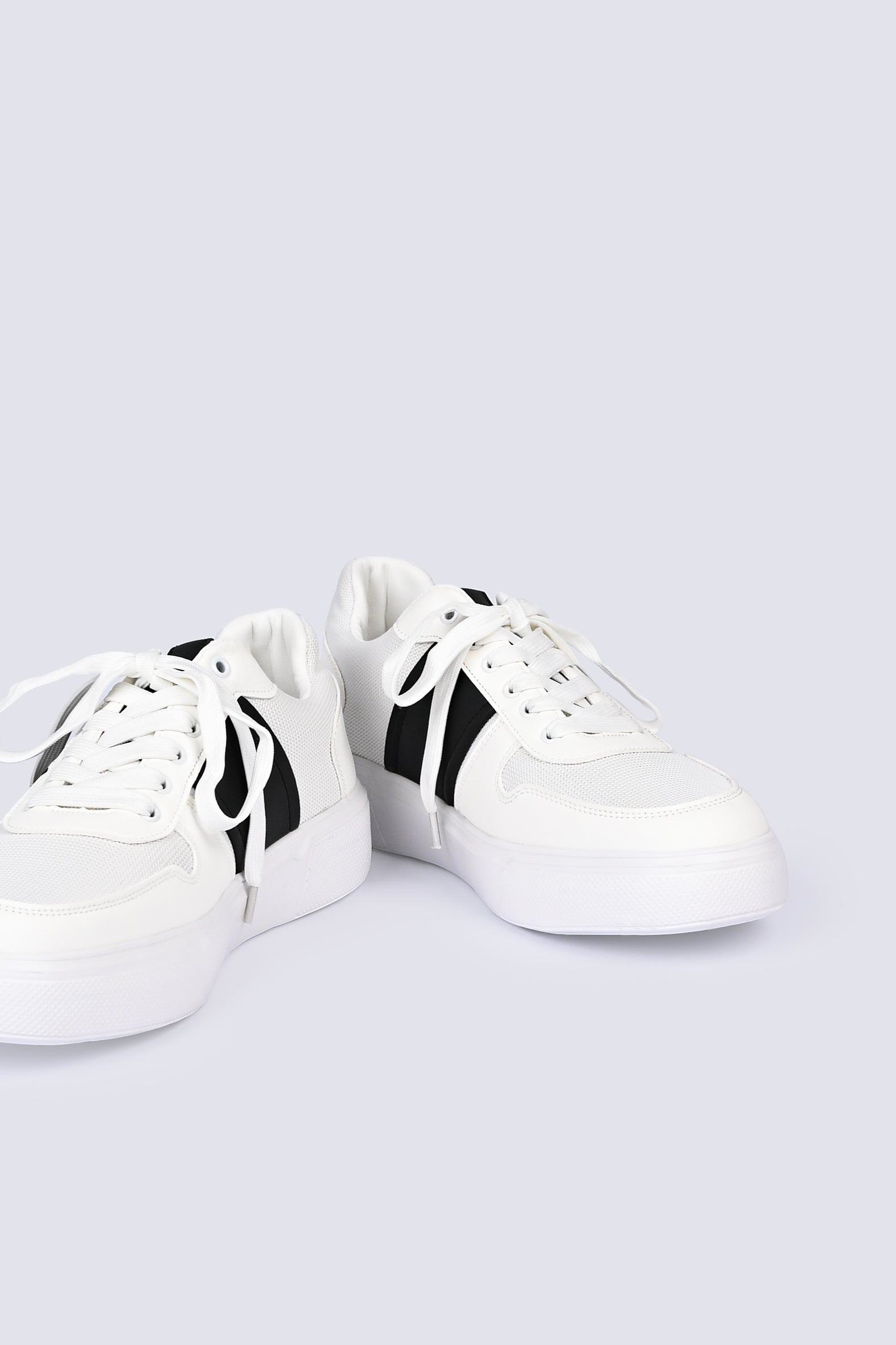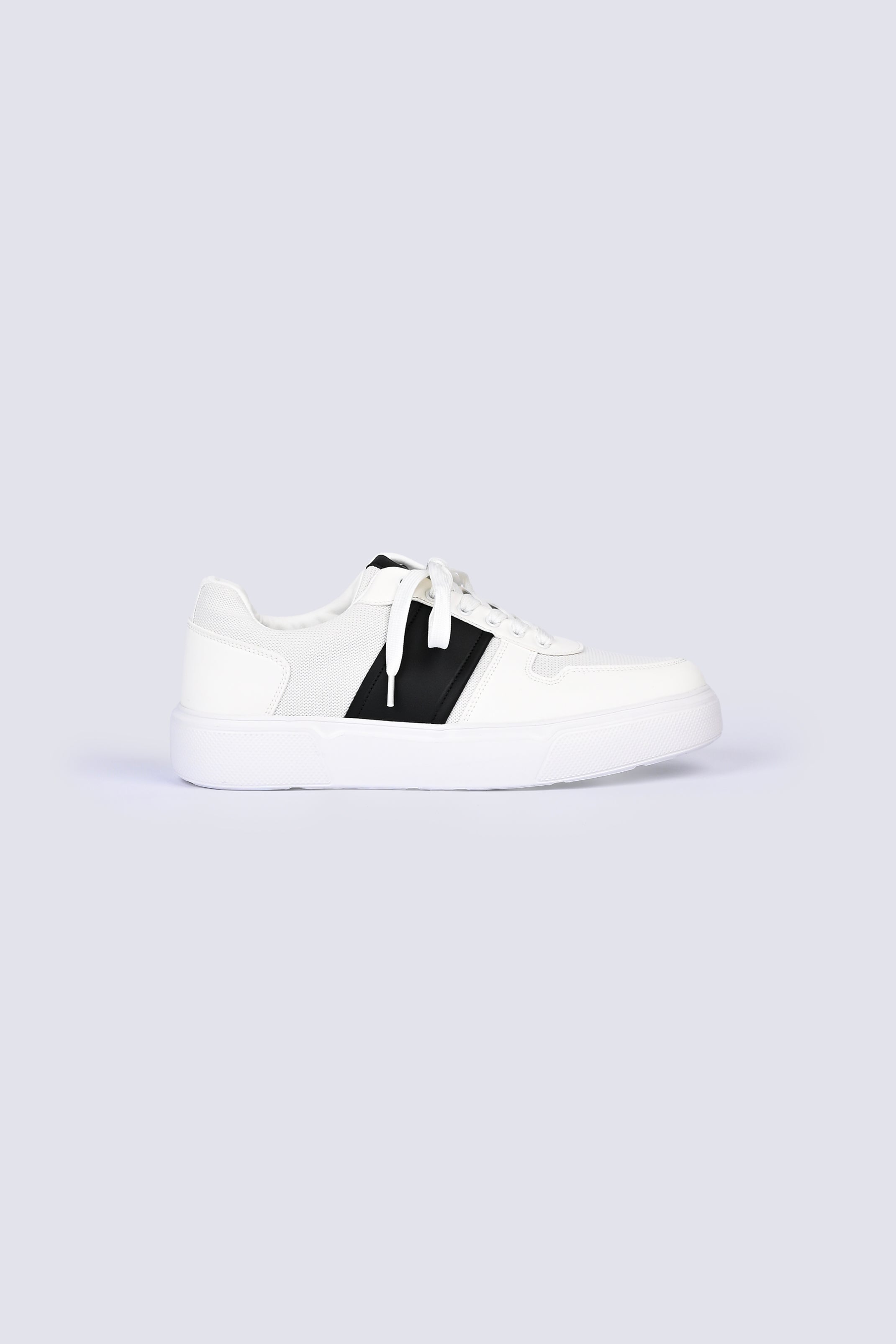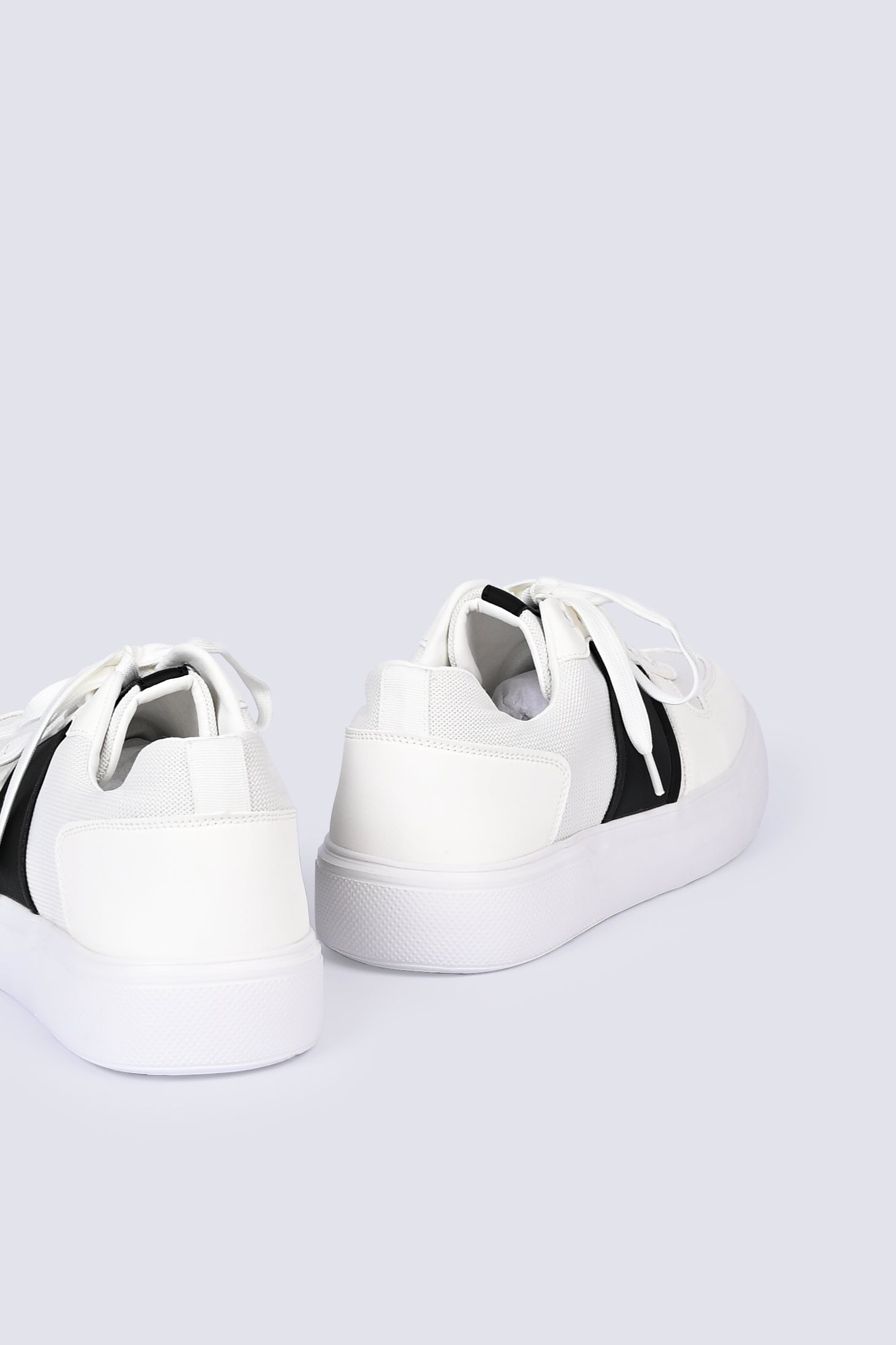 Trainers in white featuring a chunky sole, bold black stripes along the sides, and classic white laces.