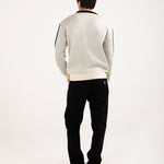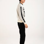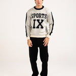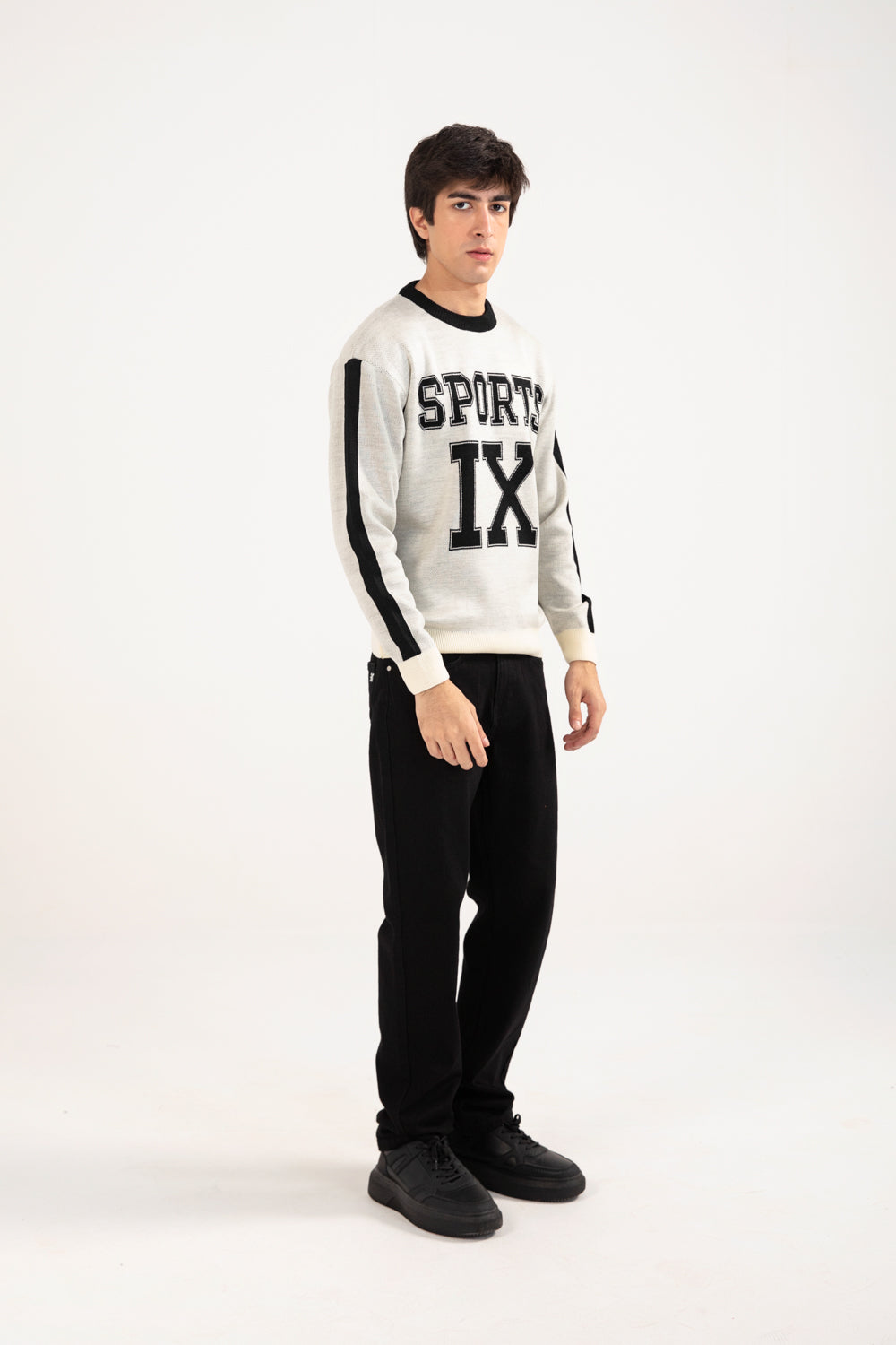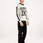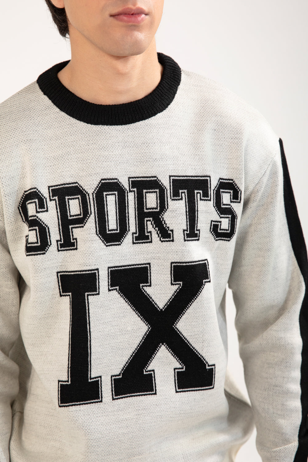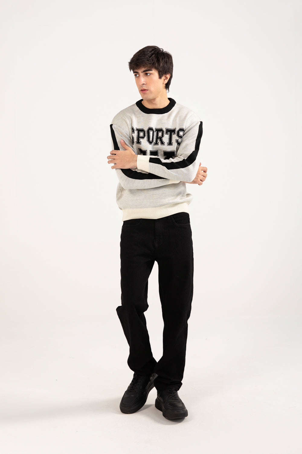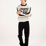 A grey crew neck sweater detailed with contrasting stripes along the sleeves for a sporty finish.