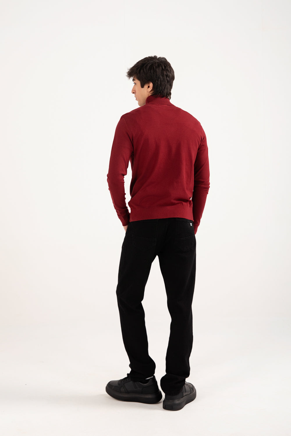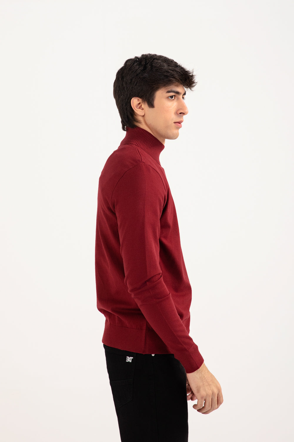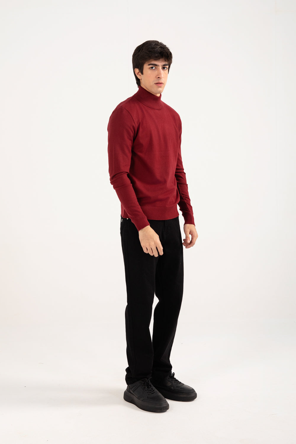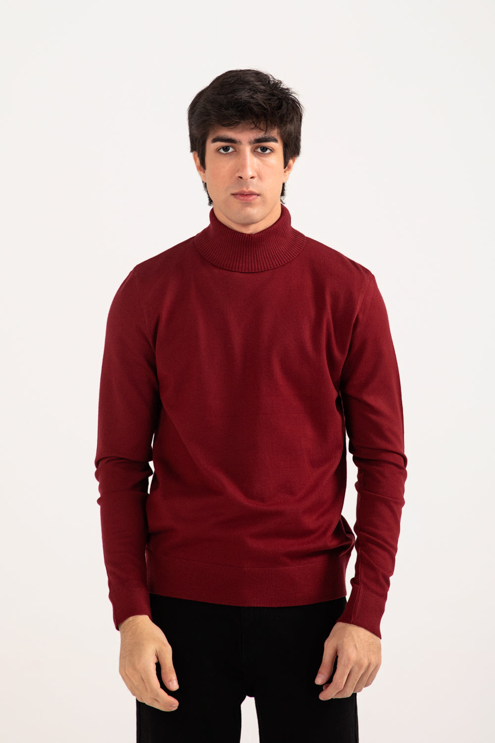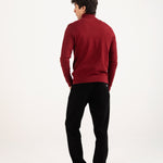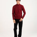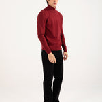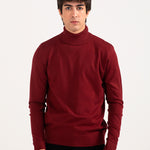 A burgundy high neck sweater with a defined fit that gives a sharp, streamlined look.