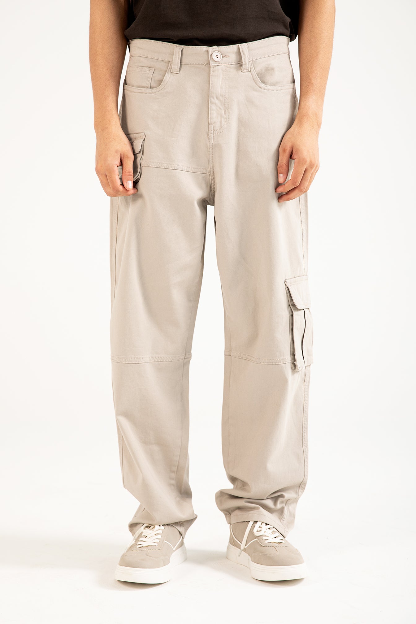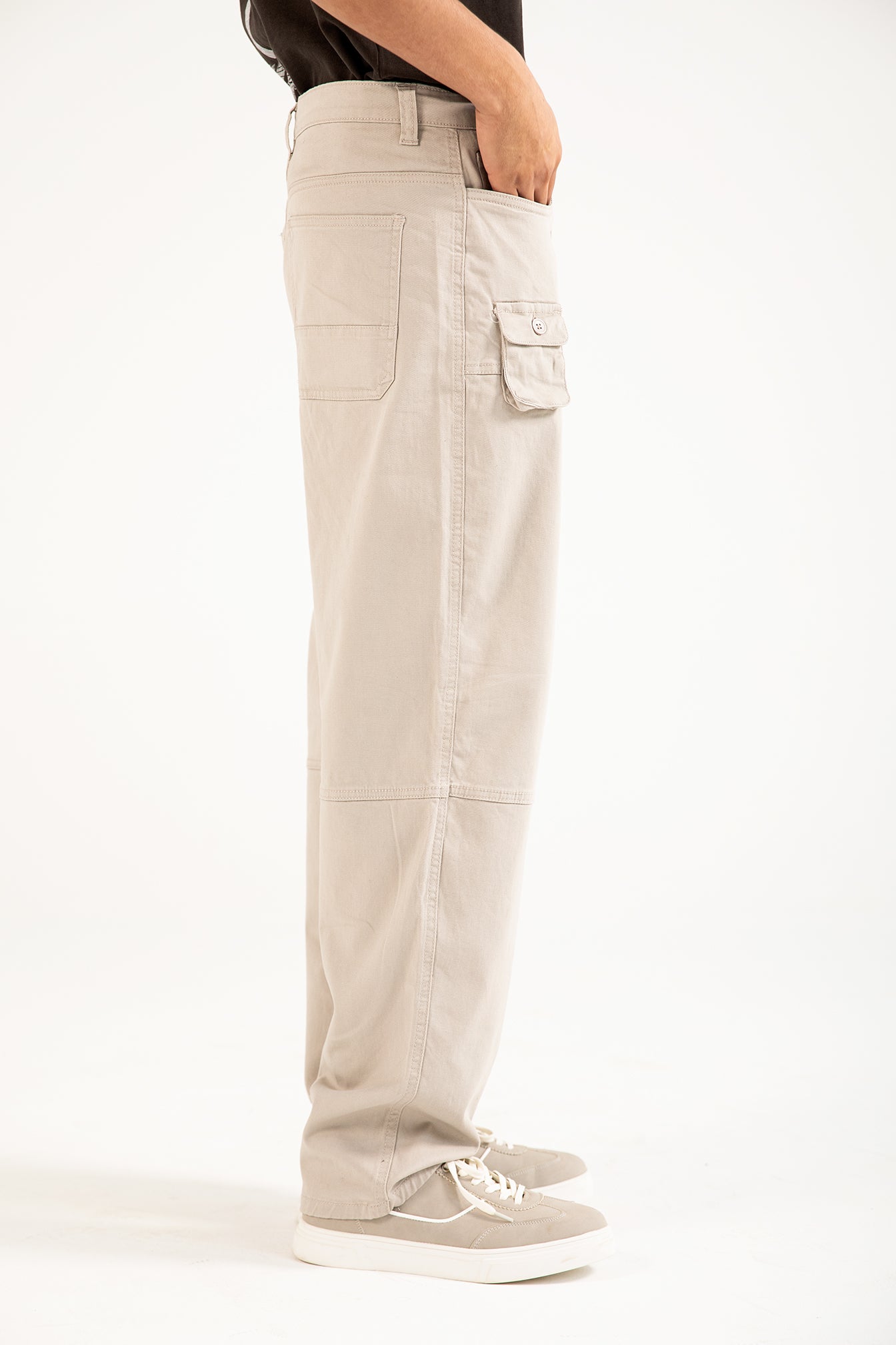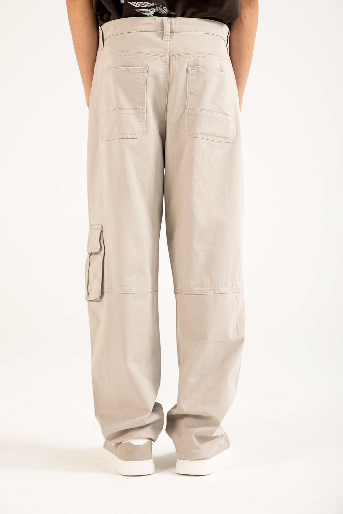 Stone-toned cotton cargos in a relaxed baggy fit, featuring scattered cargo pockets and panel detailing.