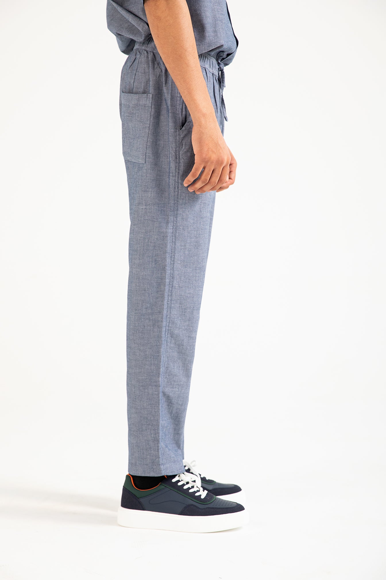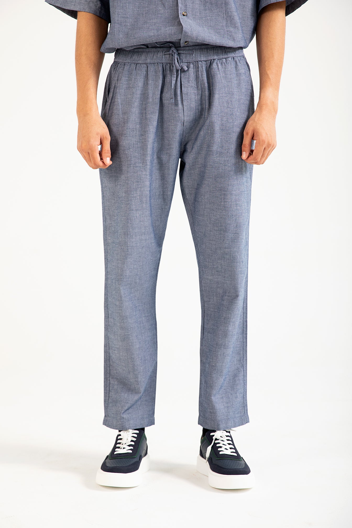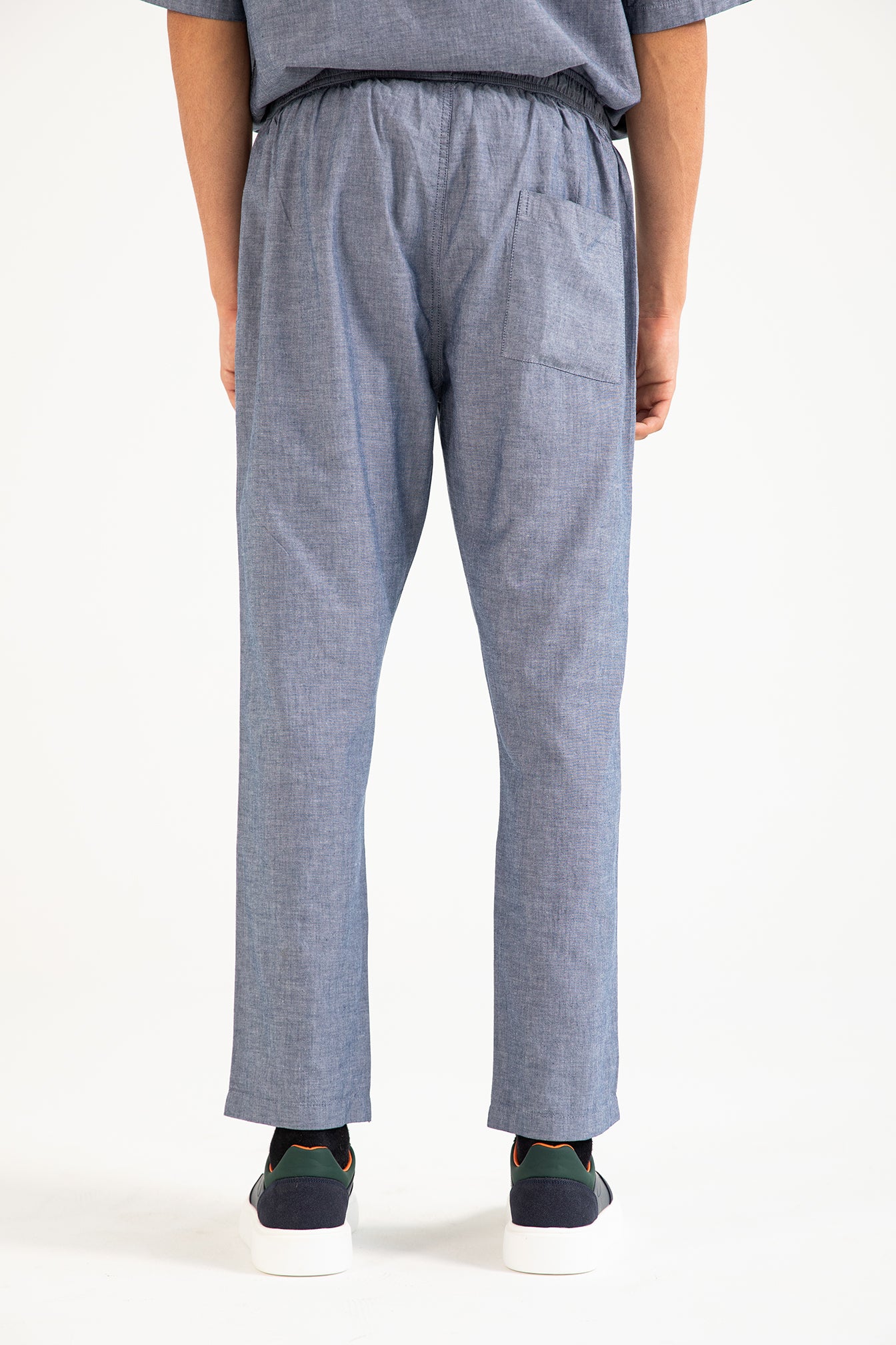 Relaxed blue linen-rich trousers with an elasticated drawstring waist and a single back pocket for an easy, breathable fit.