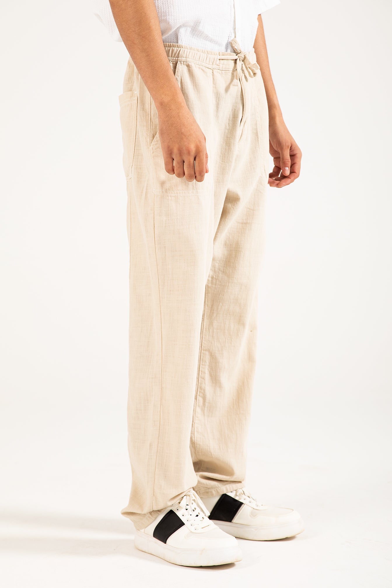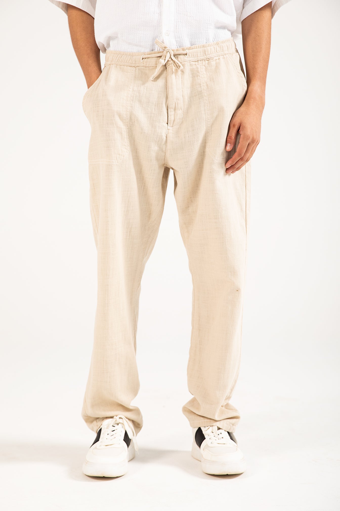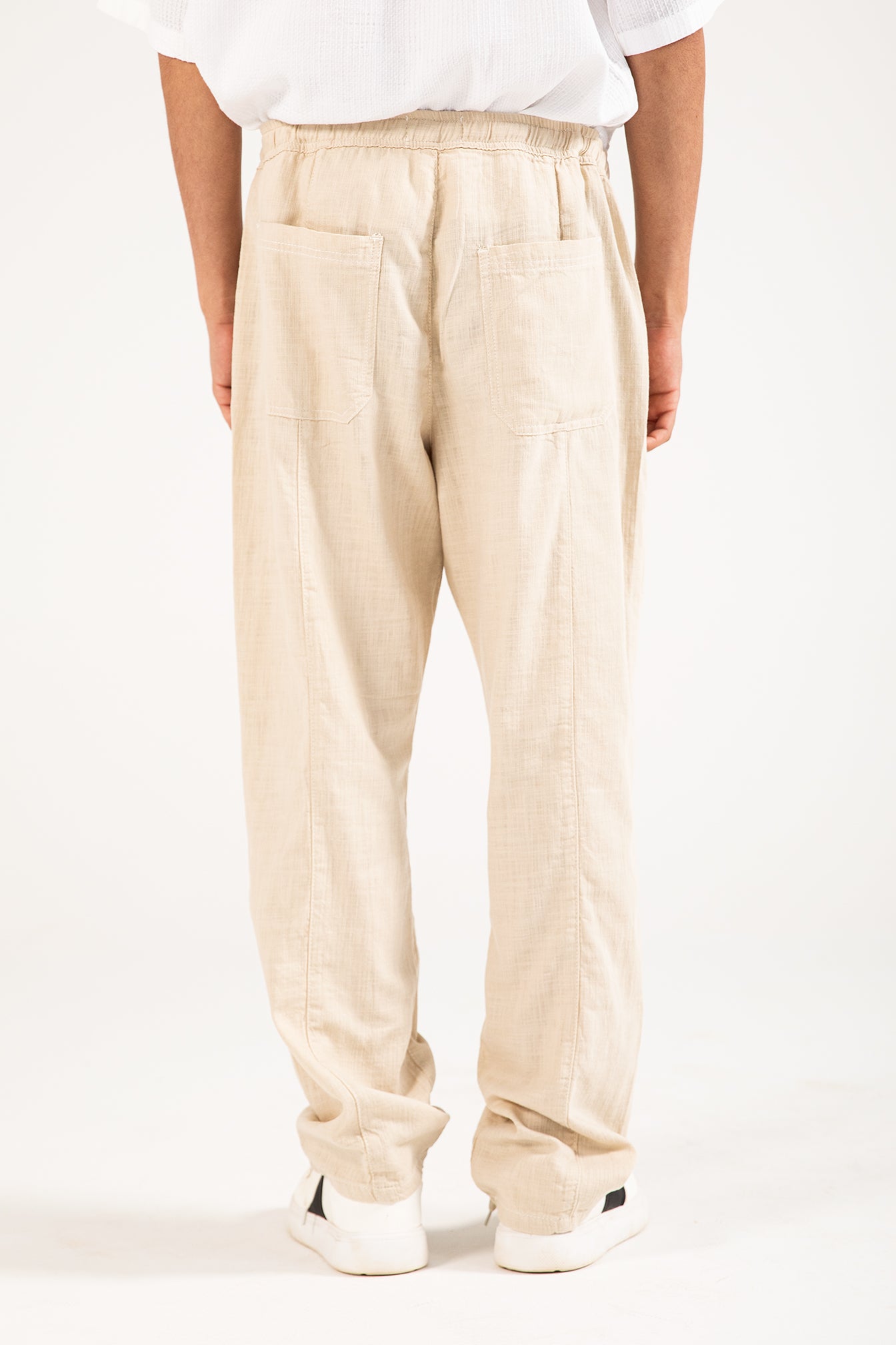 Straight fit beige cotton trousers with a textured finish, an elasticated drawstring waist, and two back pockets.