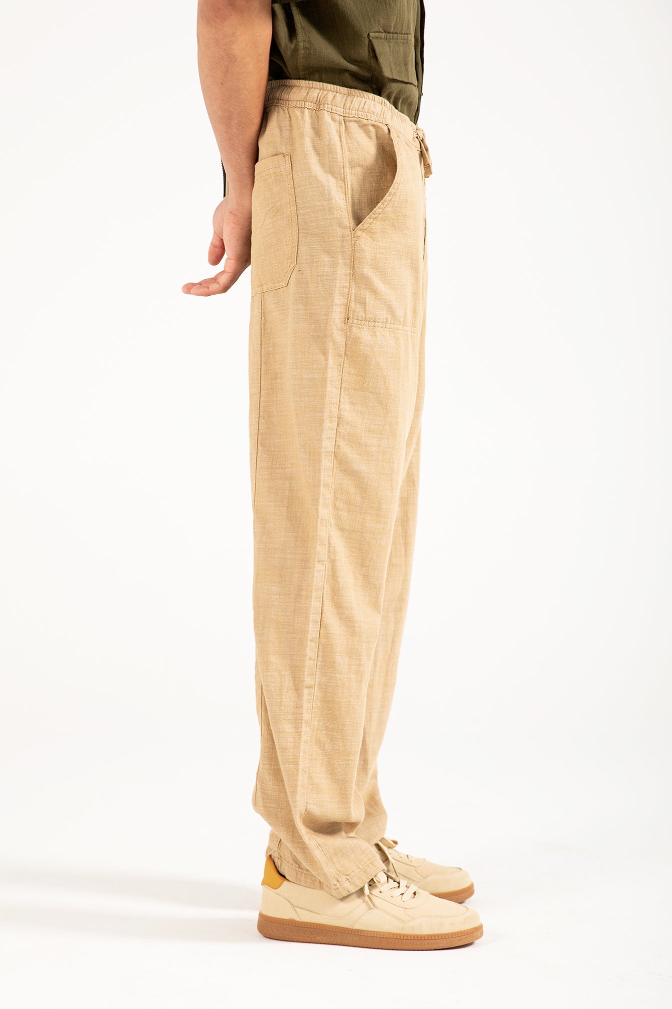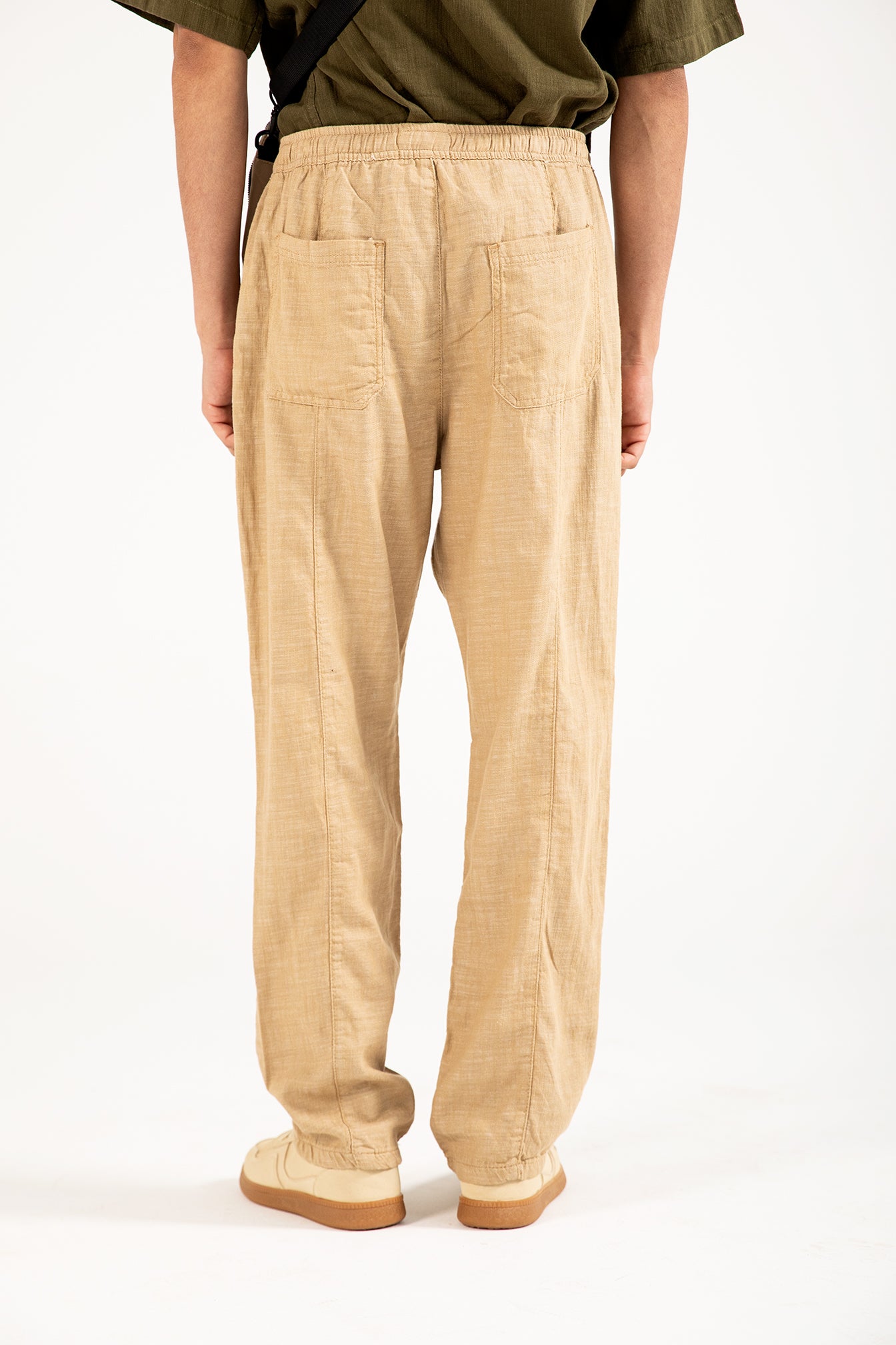 Straight fit khaki cotton trousers with a textured finish, an elasticated drawstring waist, and two back pockets.
