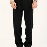 Black straight fit trousers made from a smooth synthetic blend that drapes effortlessly.