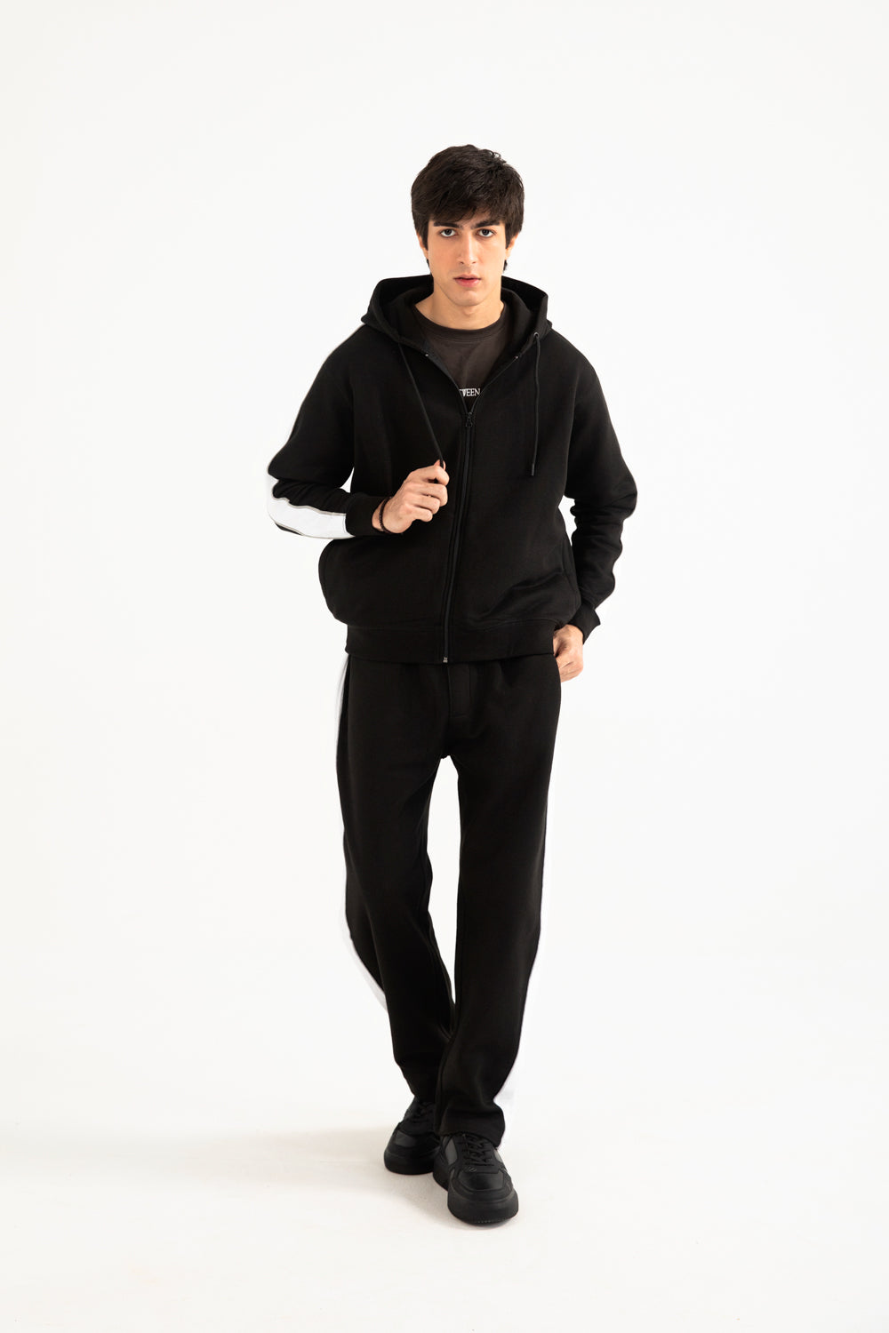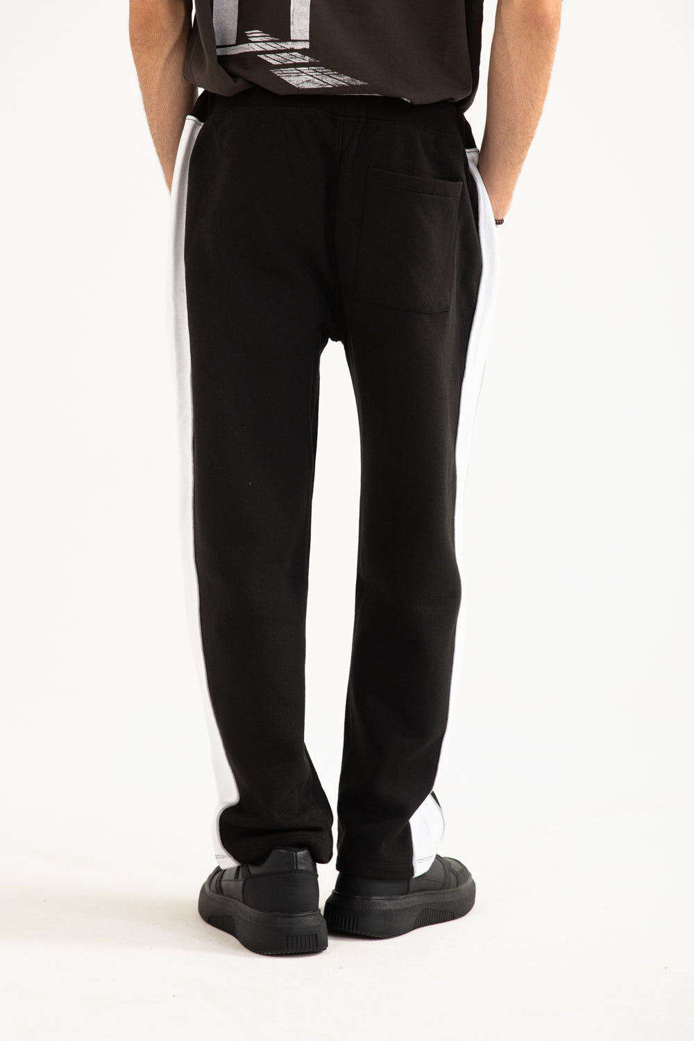 Baggy fit trouser in black made from a cotton blend with contrasting side strips, an elasticated waistband, and a single back pocket.