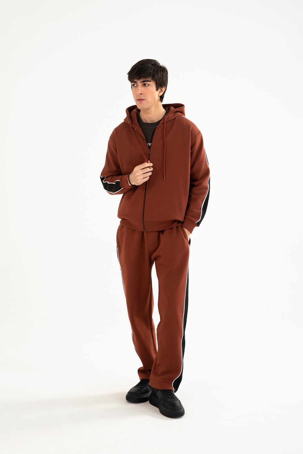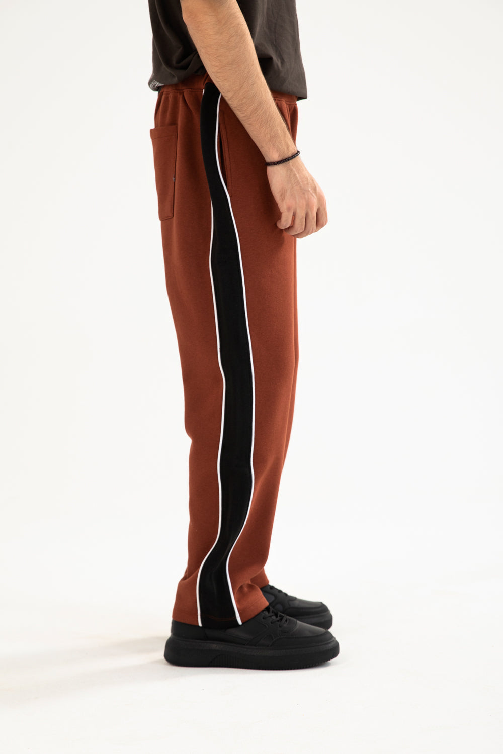 Baggy fit trouser in rust made from a cotton blend with contrasting side strips, an elasticated waistband, and a single back pocket.