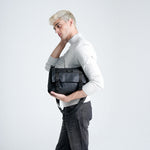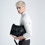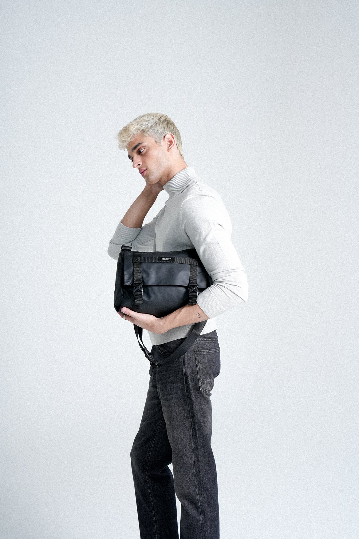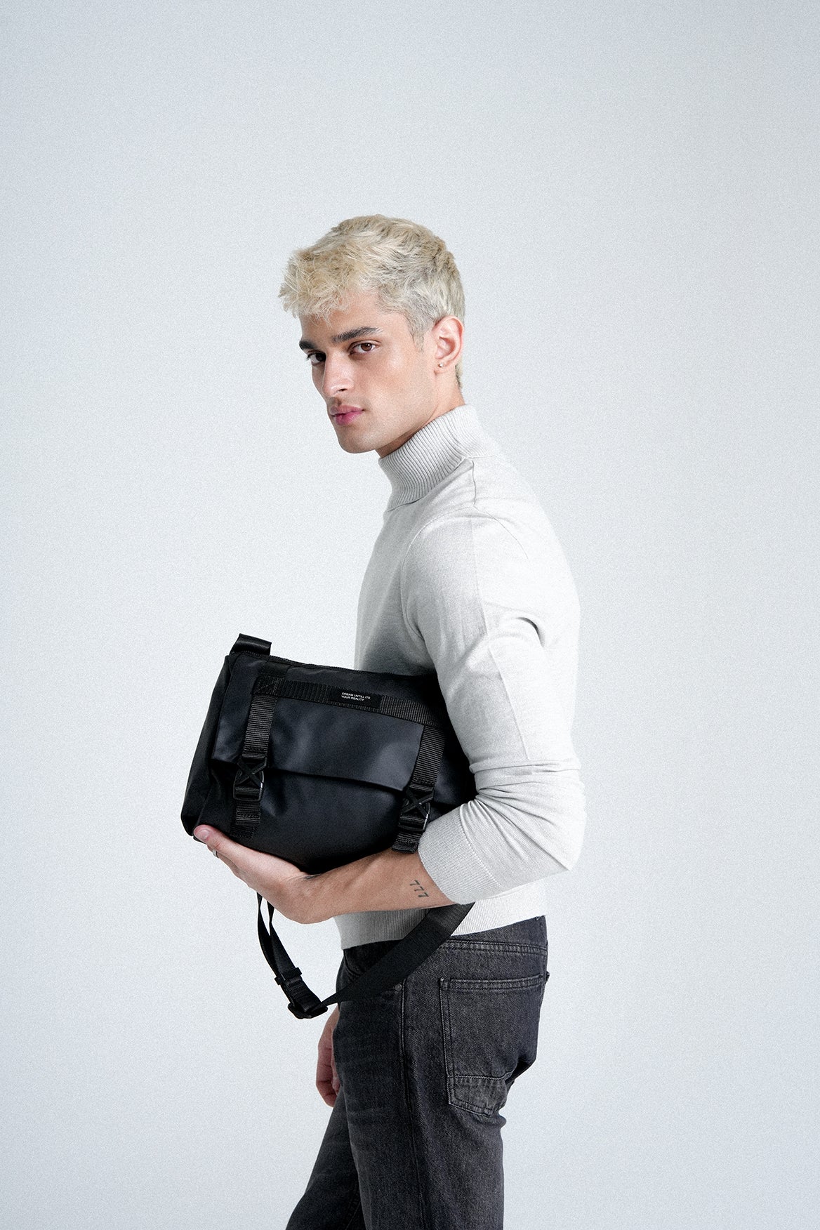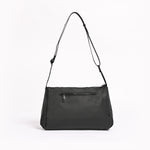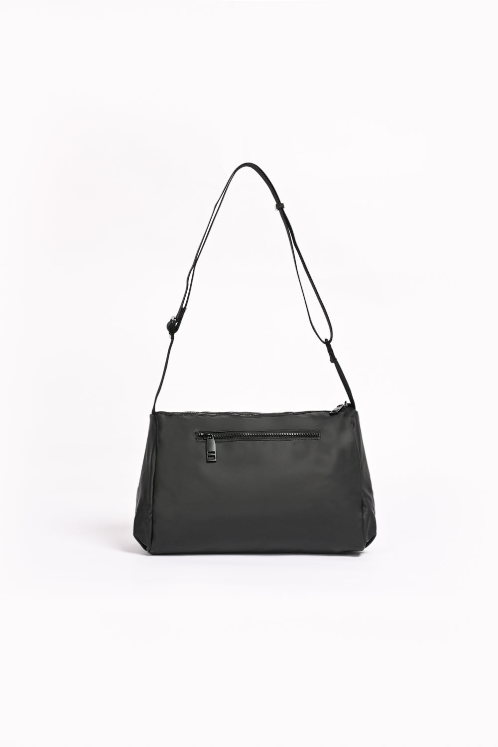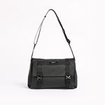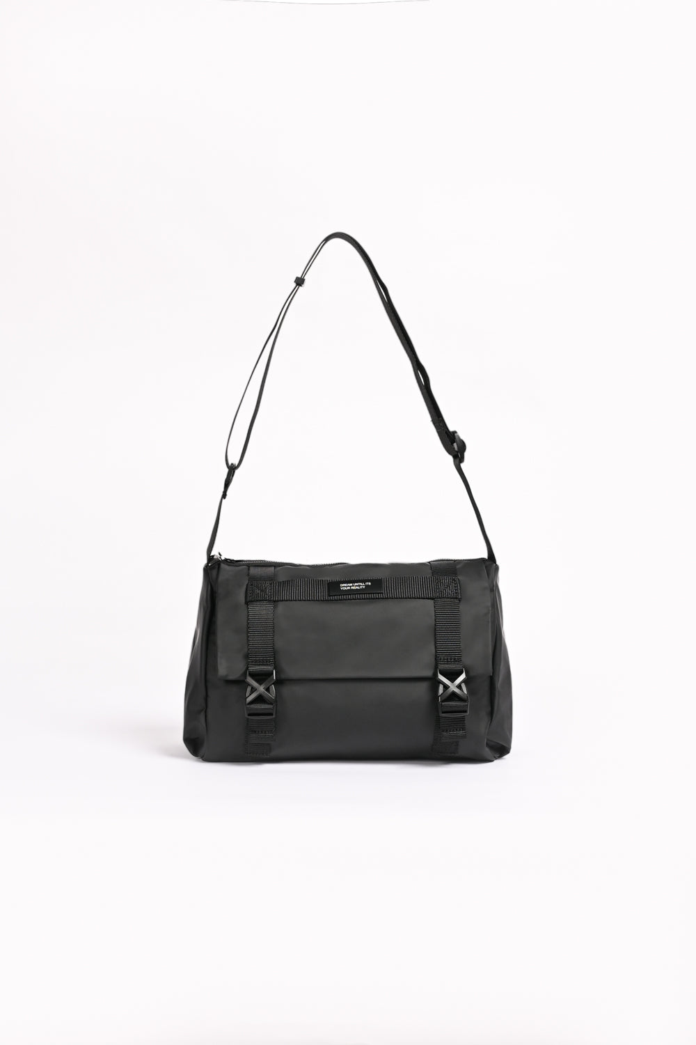 A black shoulder bag with an adjustable strap and front buckles, finished with a text print and a main pocket that closes with a zipper.