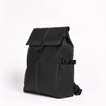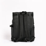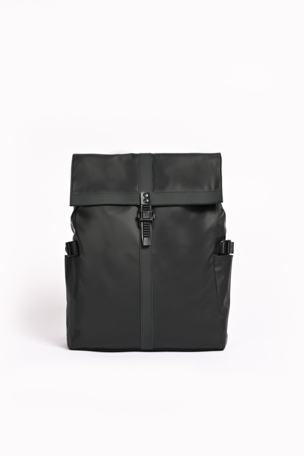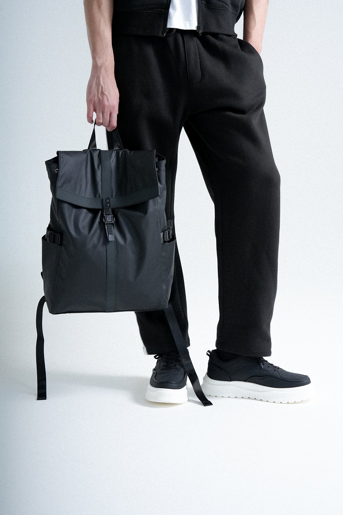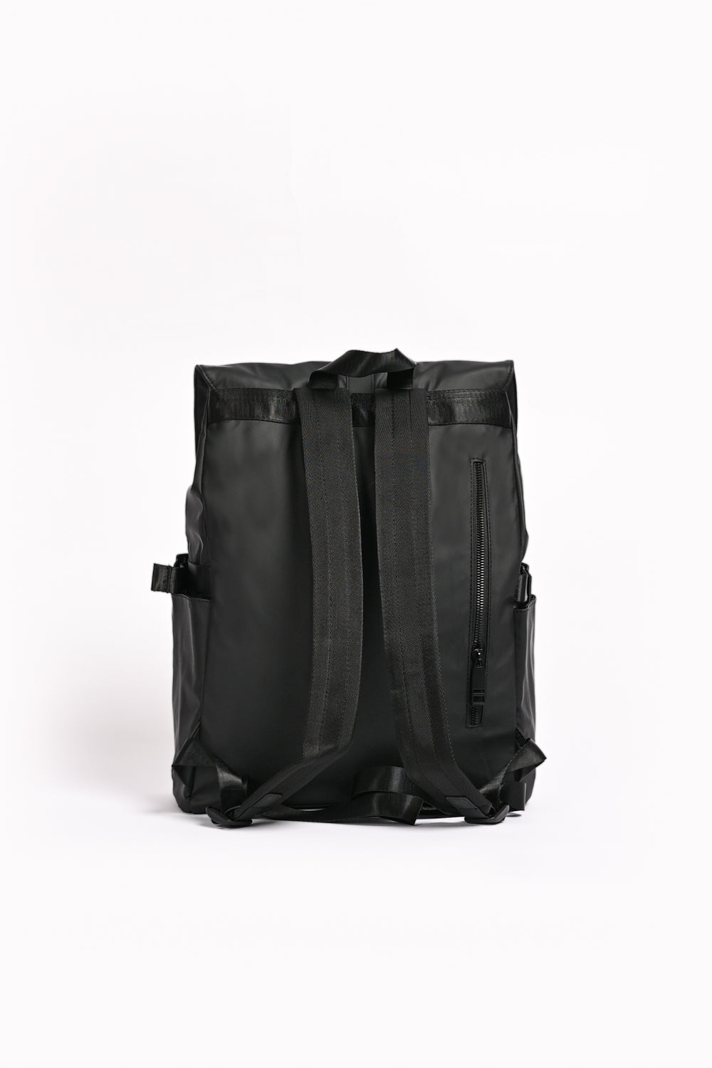 A large black backpack in faux leather with a flap design, an inner zipper closure, and several pockets for easy organization.