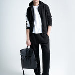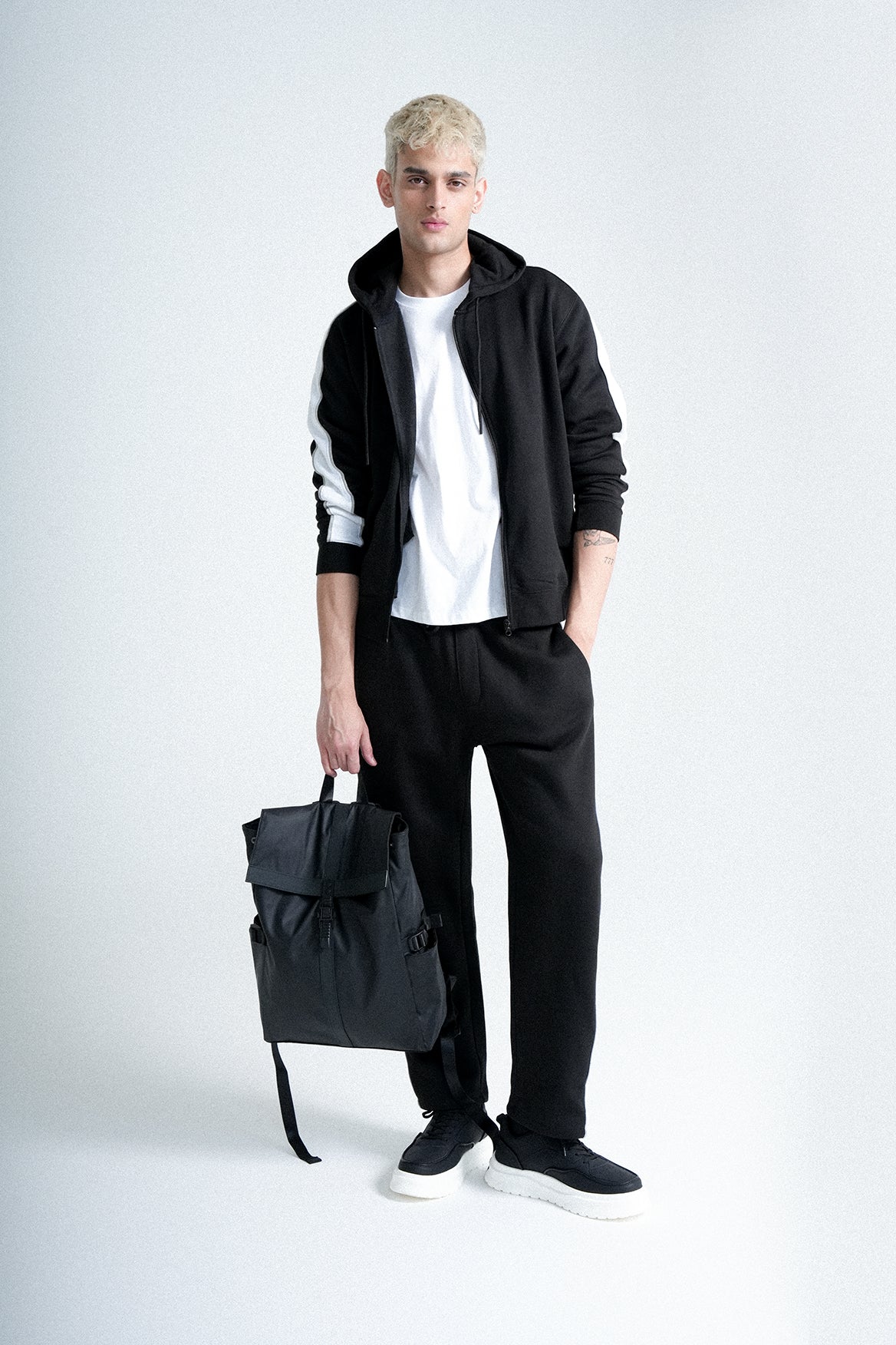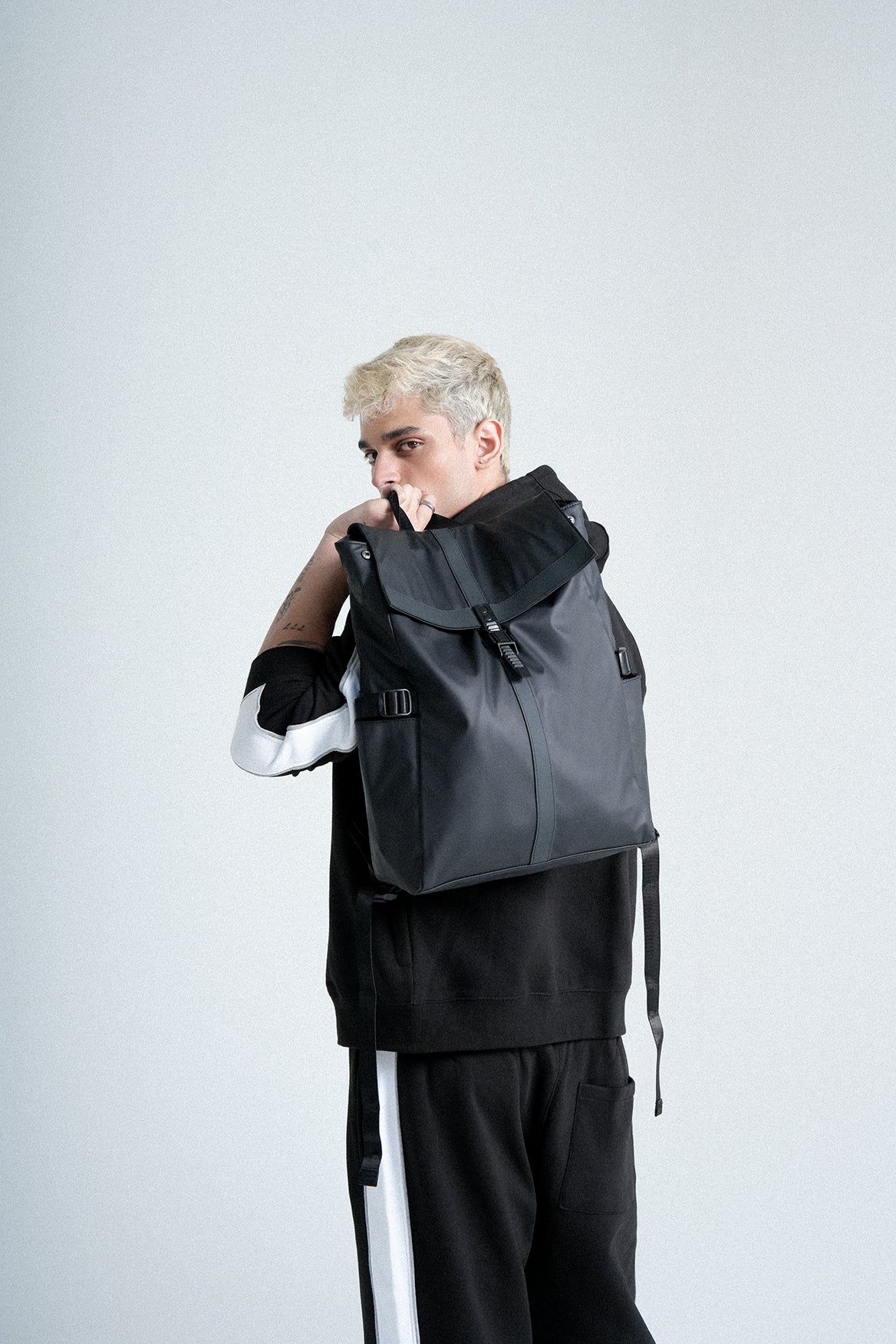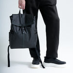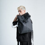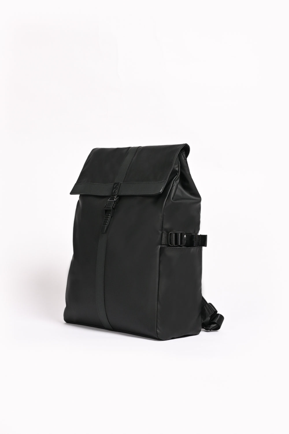 A large black backpack in faux leather with a flap design, an inner zipper closure, and several pockets for easy organization.