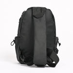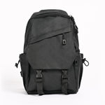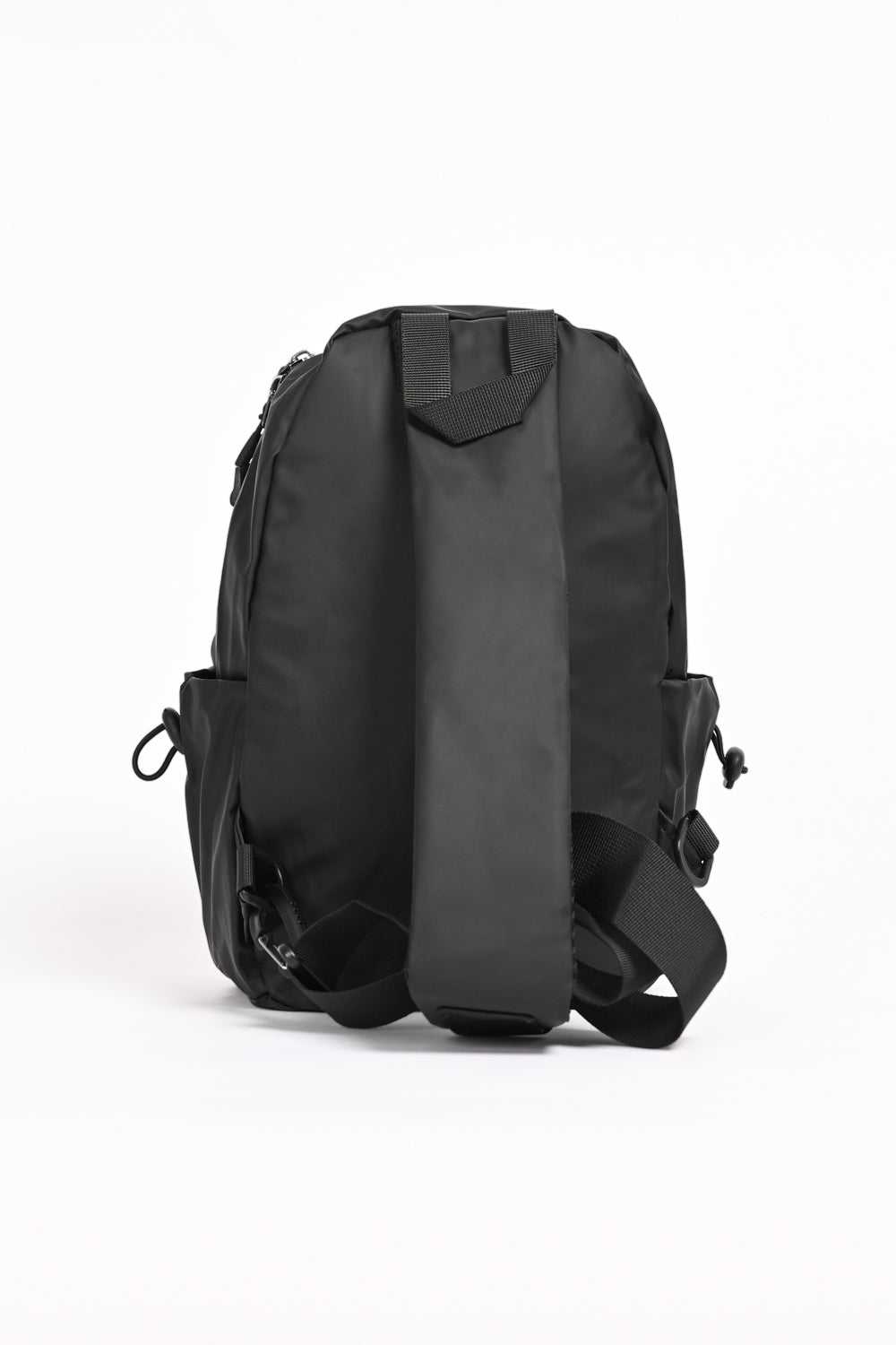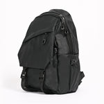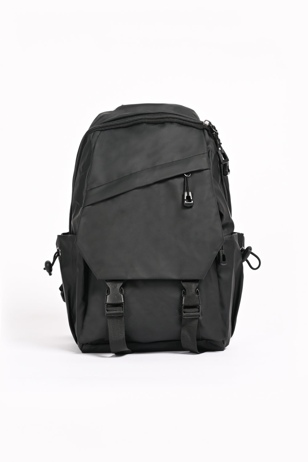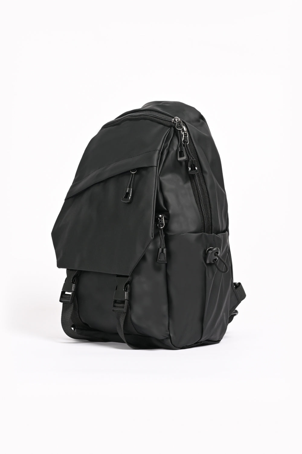 A black crossbody bag in faux leather with a single strap, styled like a backpack and finished with a front flap that fastens with buckles, and a slanted zipper detail on the flap.