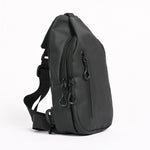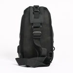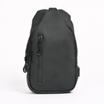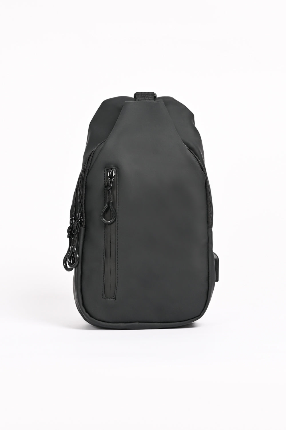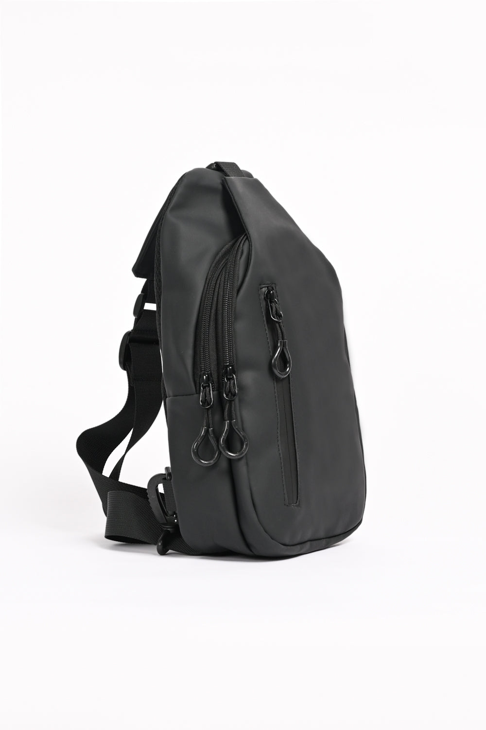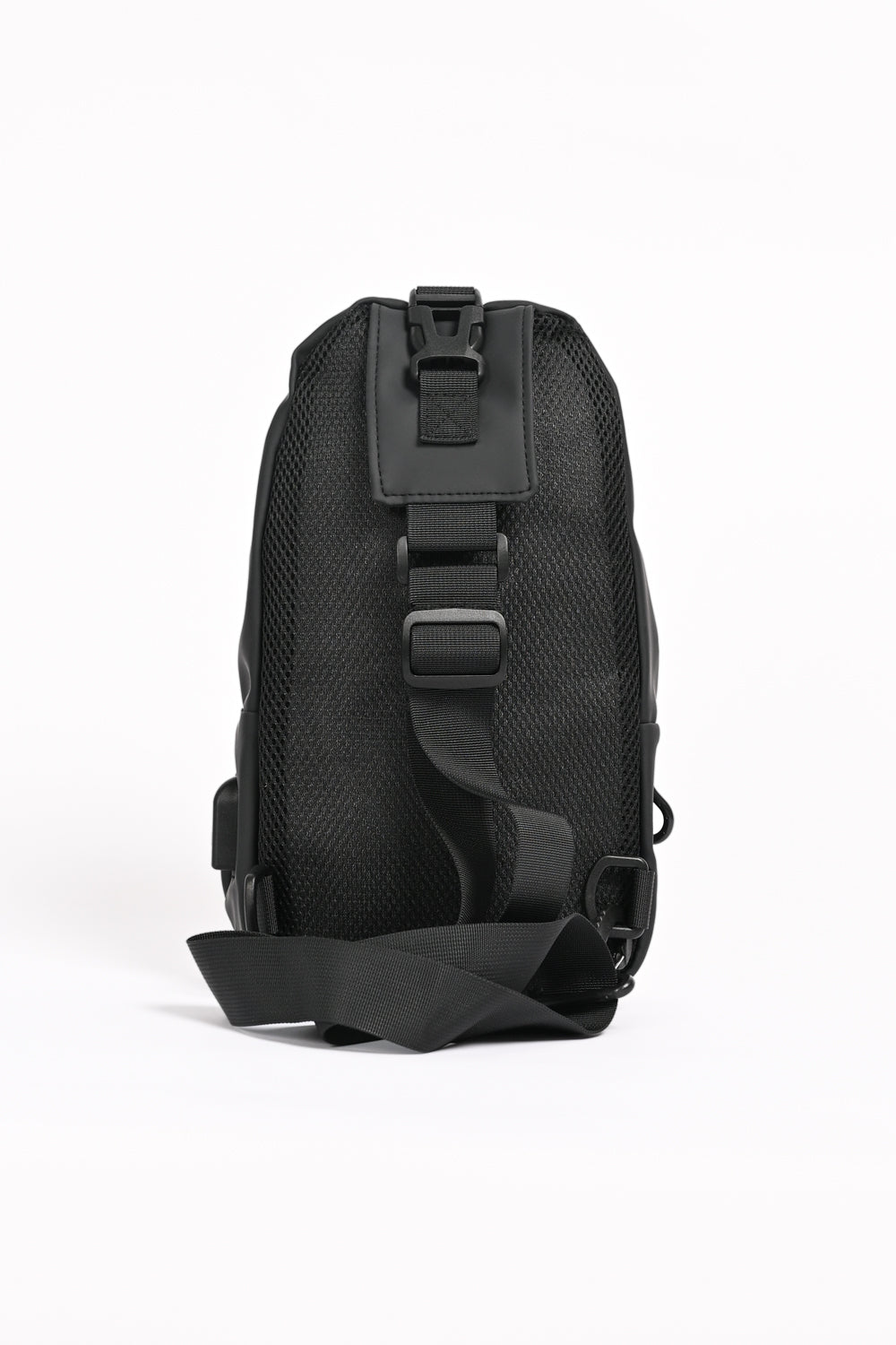 A black crossbody bag in faux leather with black accents, styled with a single strap in a backpack shape and finished with multiple zipped pockets.