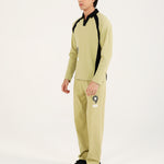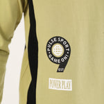 An olive full sleeve raglan polo in cotton with a johnny collar and a front print.