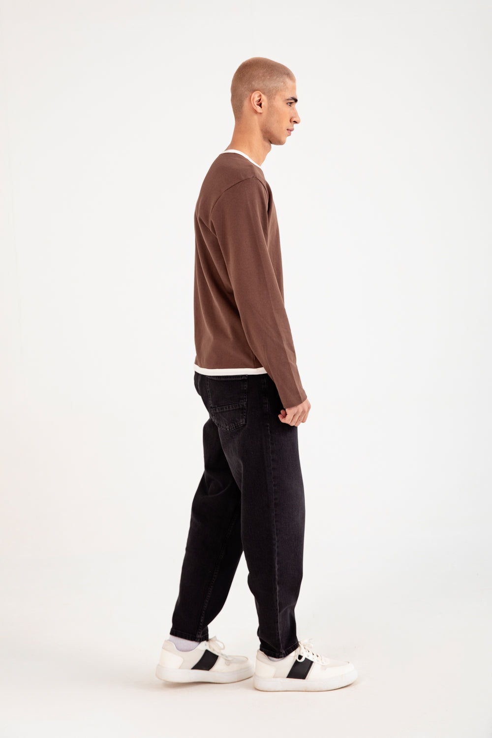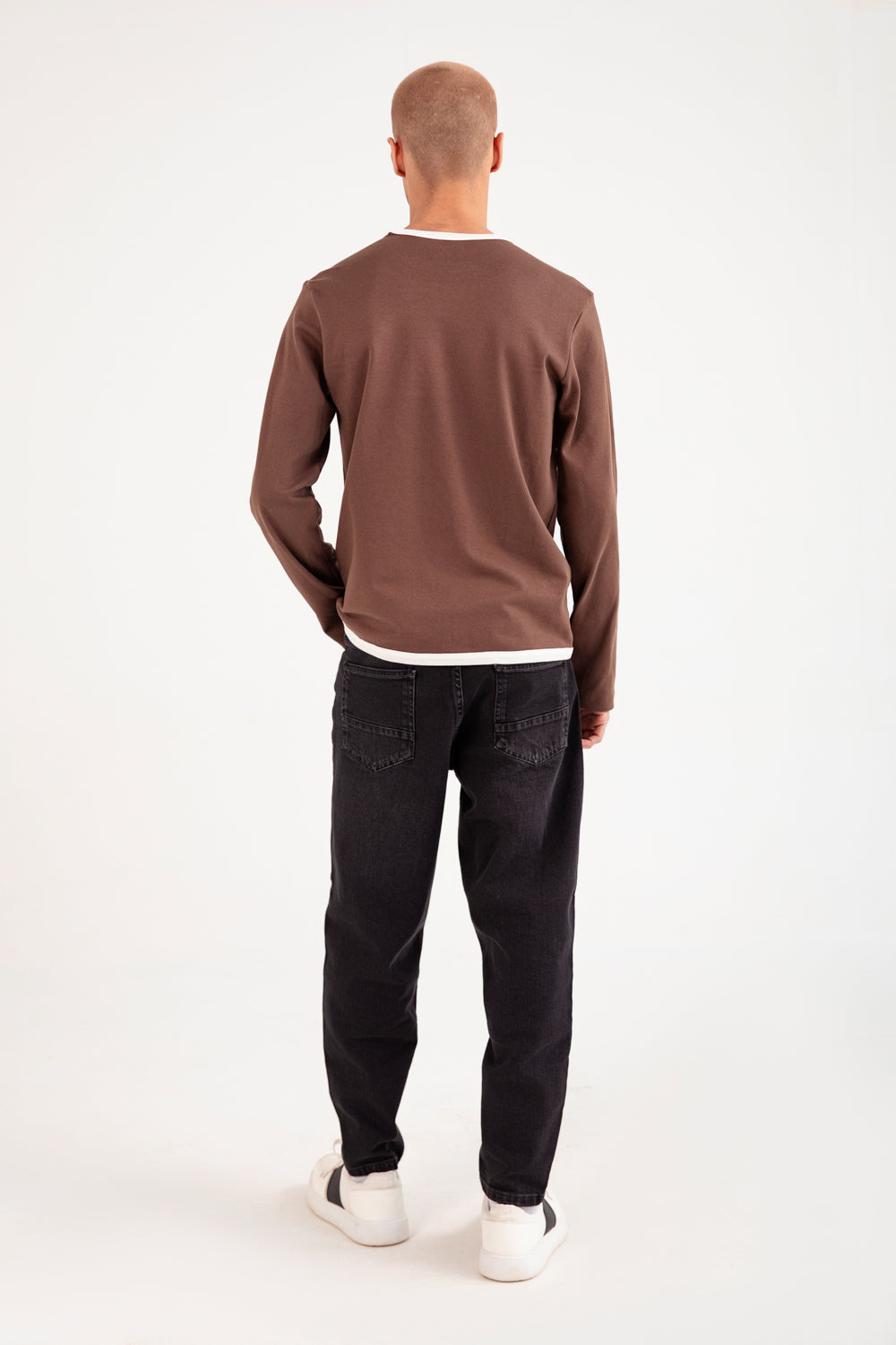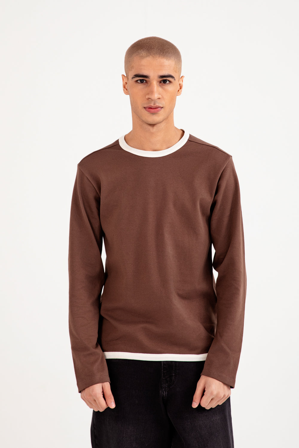 Stretchy full sleeve tee in brown made from a soft cotton blend, accented with white trim at the neckline and hem.