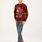 A rust full sleeve cotton tee in a boxy fit, featuring a bold front graphic and text print on the back.