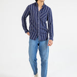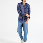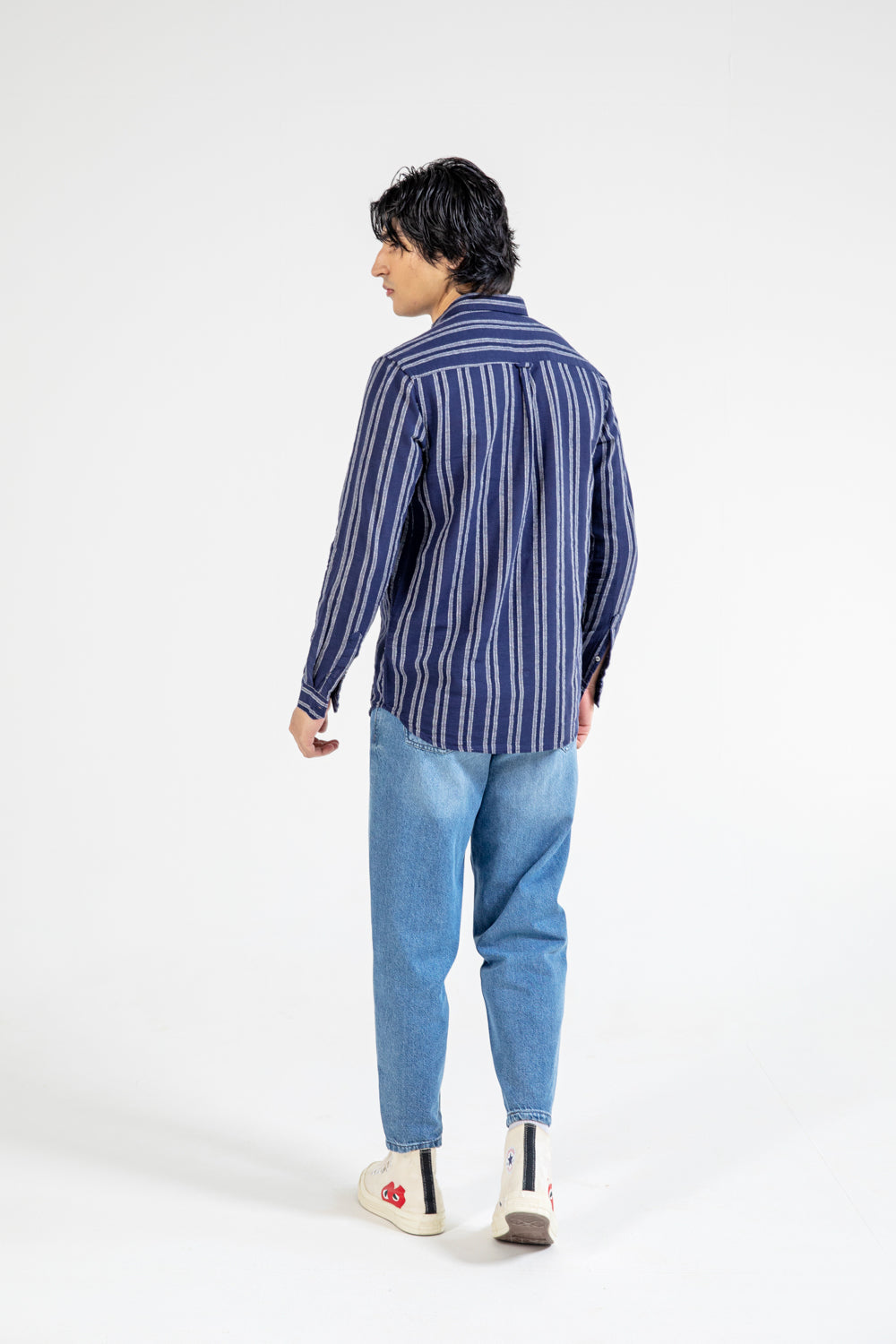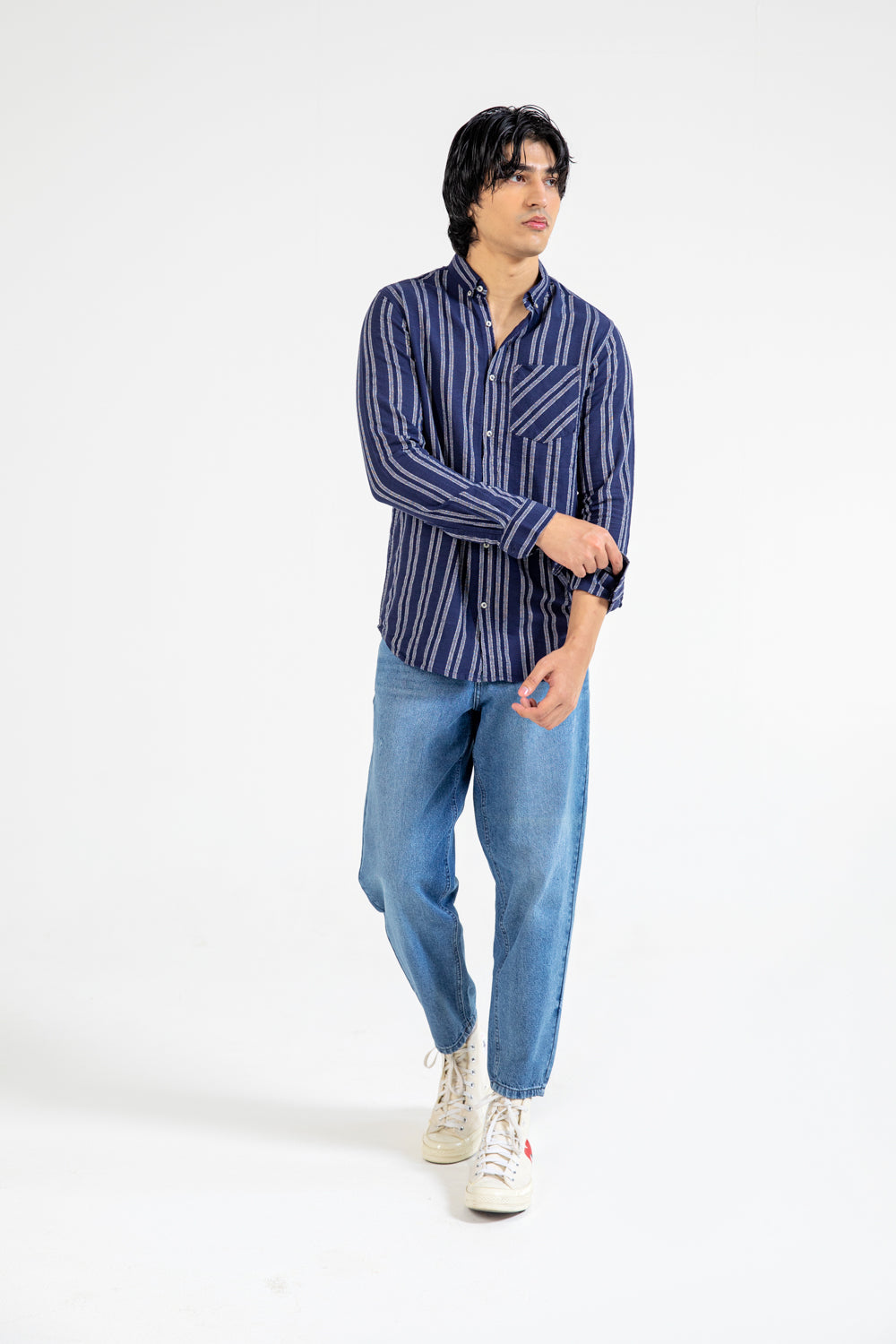 A blue button down shirt in cotton with vertical stripes, full sleeves, and a single chest pocket.