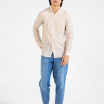 Made from cotton with vertical stripes, this khaki button down shirt features full sleeves and a clean textured finish.