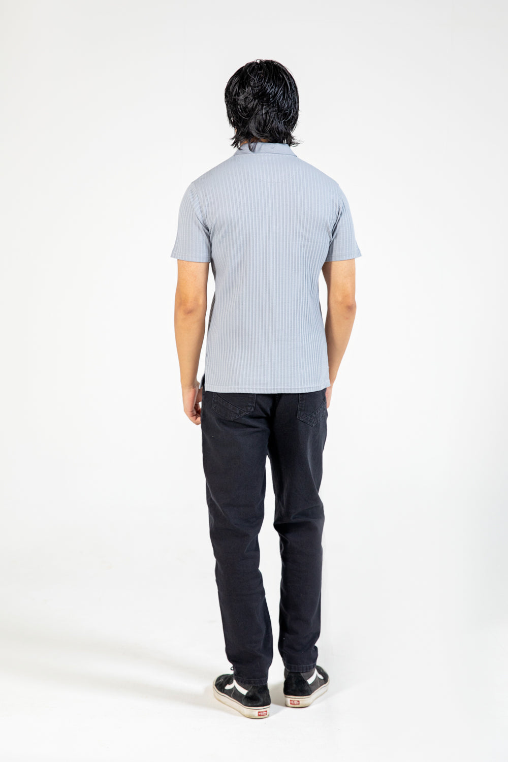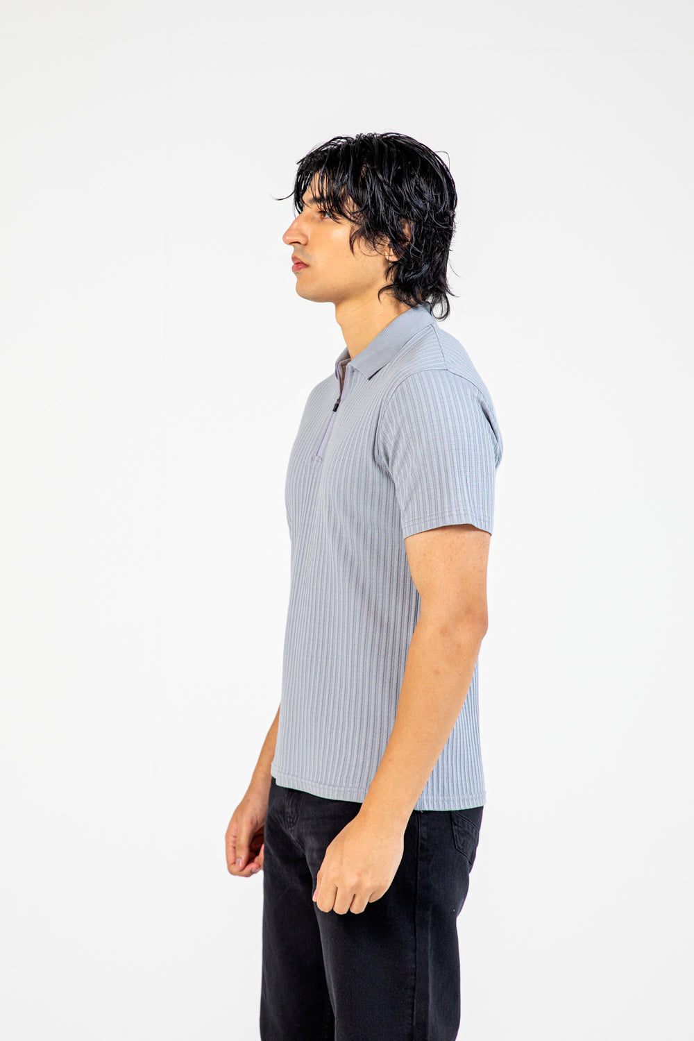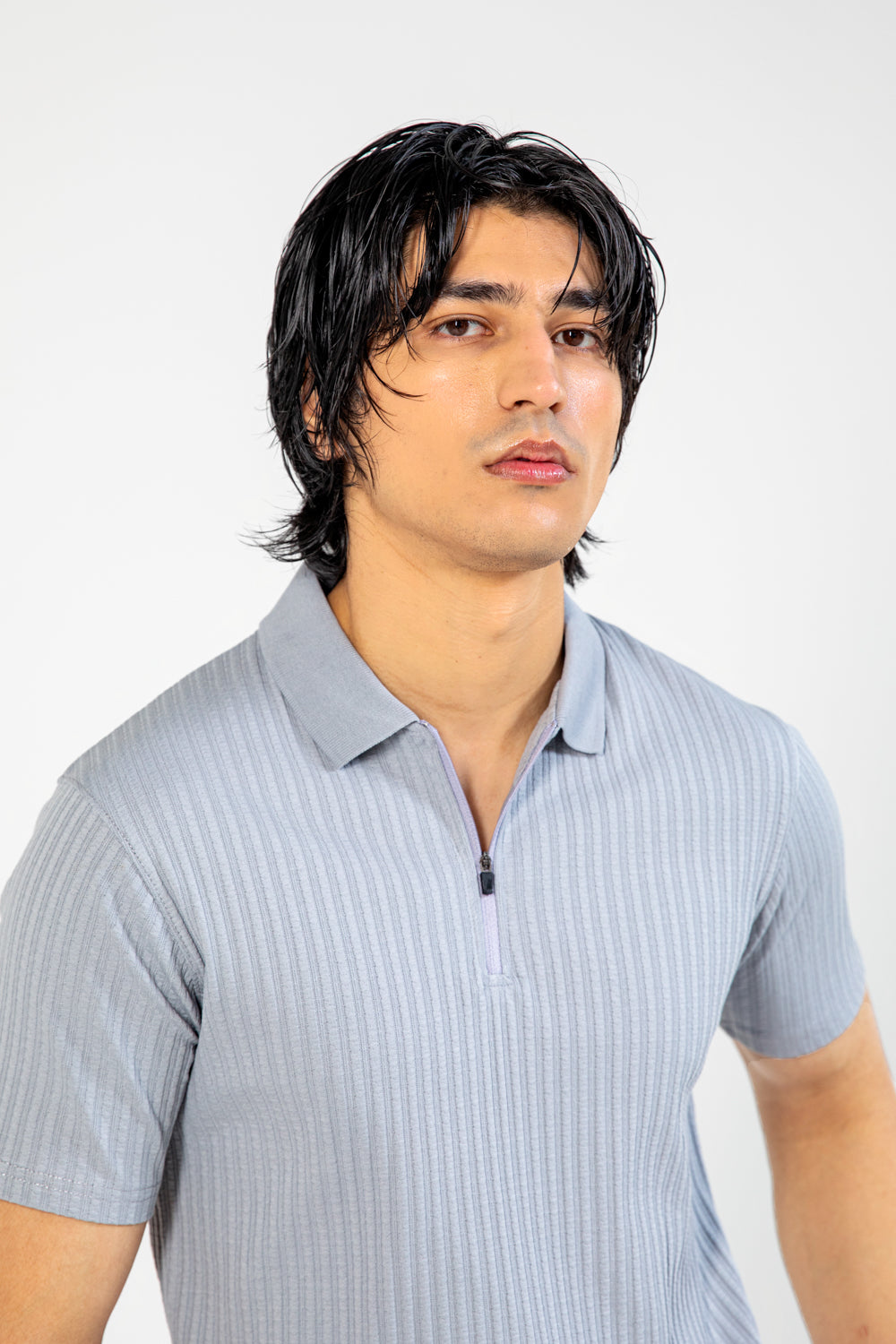 A grey textured polo in a cotton blend with added stretch, finished with a sleek zipper closure.