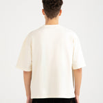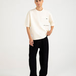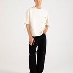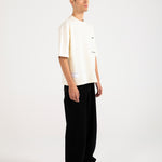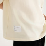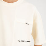 Off-white tee in a cotton synthetic blend with a textured finish, featuring a large chest pocket with text print and a sewn-on patch at the lower right side.