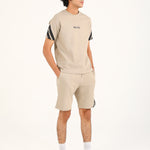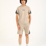 A sand toned tee with subtle text on the front and striped prints along the sleeves.