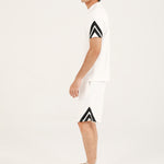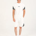 A white tee with subtle text on the front and striped prints along the sleeves.