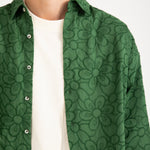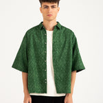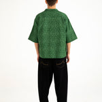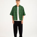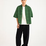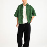 Green cotton shirt with a boxy fit, resort collar, and contrasting buttons.
