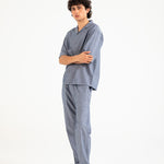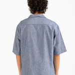 Blue shirt in a cotton linen blend with a relaxed baggy fit and resort collar.
