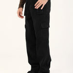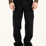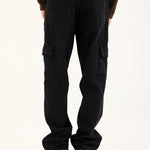 Black straight fit cargo denim with a detachable belt and multiple pockets that bring functionality to the look.