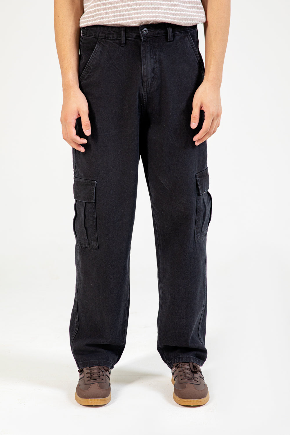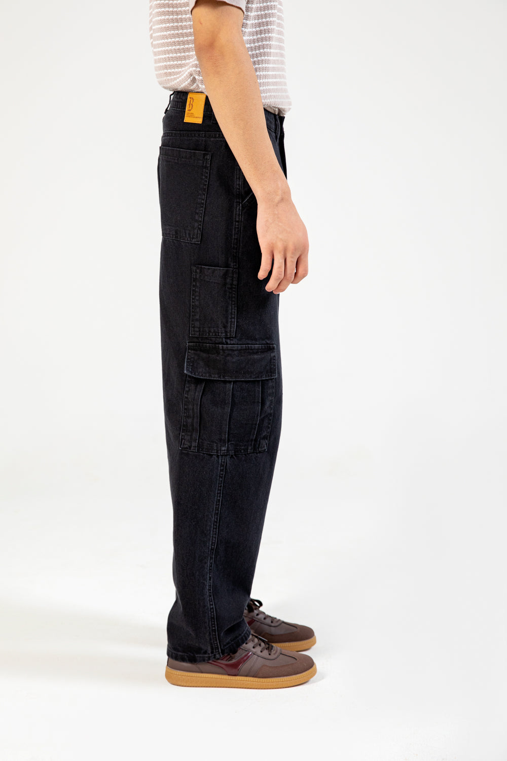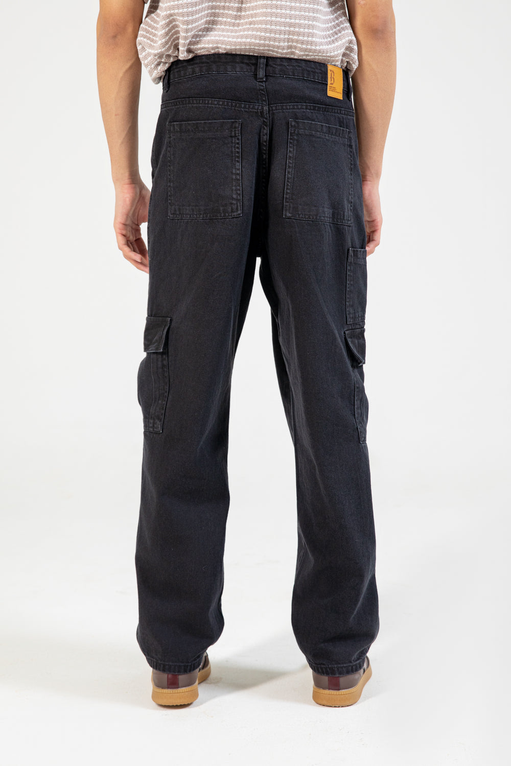 Black denim cargo pants in cotton with a baggy fit and spacious utility pockets.